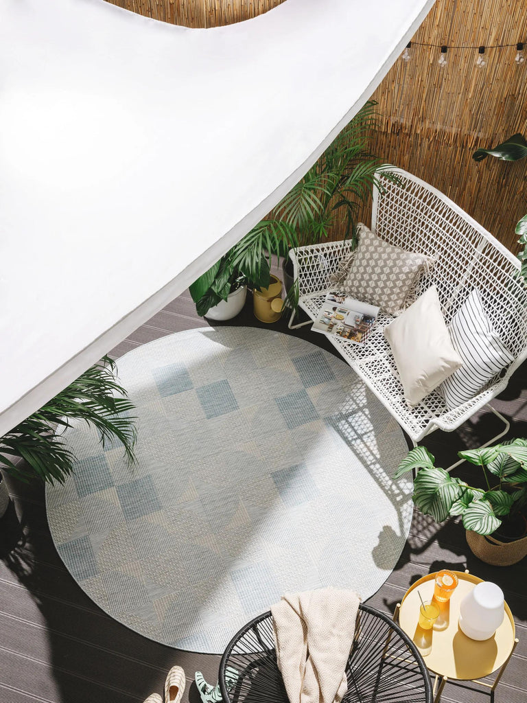 Tapis scandinave motif géométrique rond marron naturel d'intérieur et d'extérieur 200 cm de diamètre