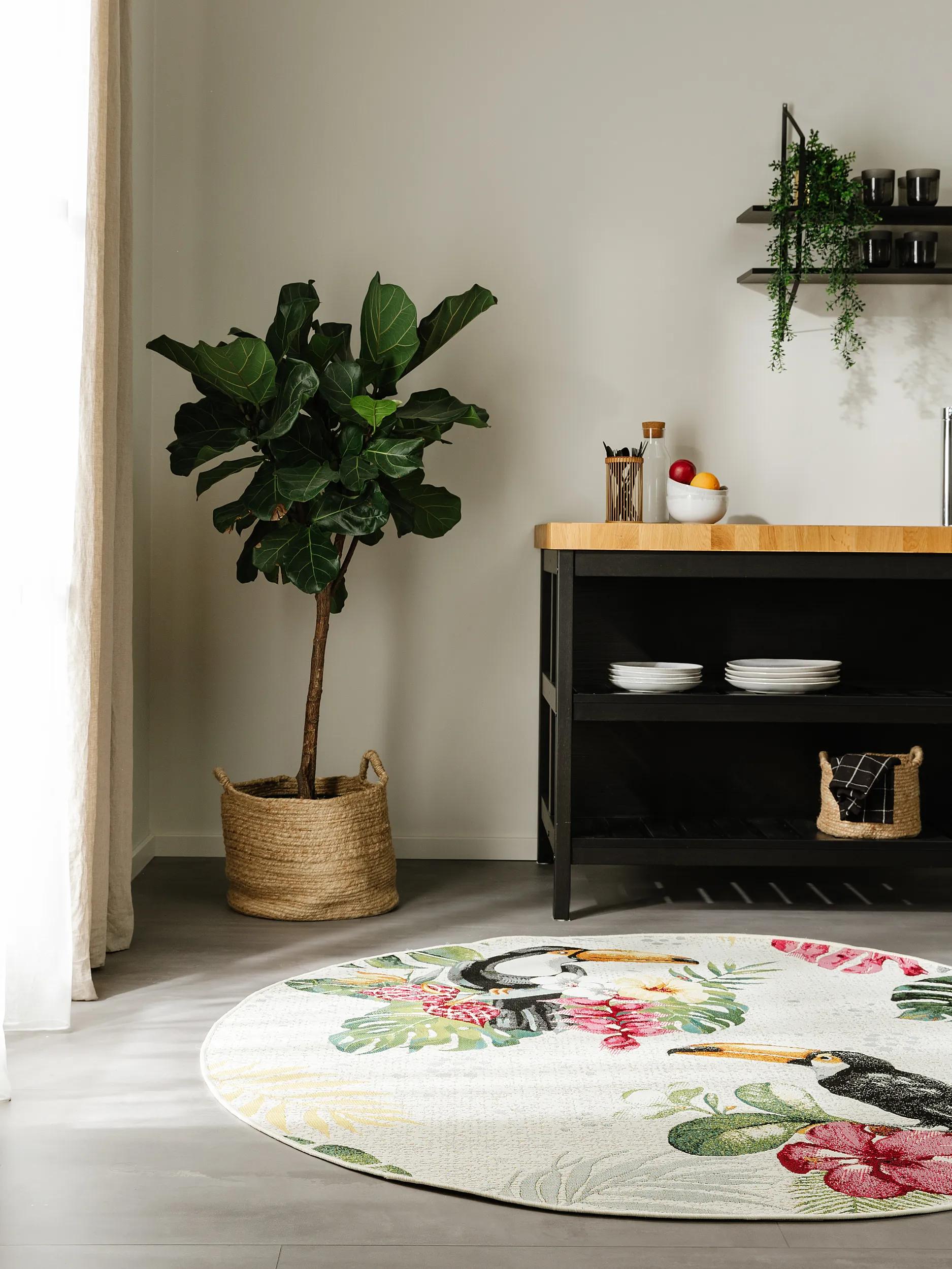 Ludique et plein de fraîcheur, ce tapis au style moderne séduit par son motif feuille et la vitalité joyeuse de ses tons multicolores. Dans sa version ronde de 160 cm de diamètre, il s’installe idéalement sur une terrasse, un balcon ou un espace extérieur familial, où il insuffle énergie, fantaisie et bonne humeur. Son dessin végétal stylisé évoque la nature dans toute sa diversité, apportant un souffle d’évasion et de légèreté. La forme ronde favorise la convivialité et adoucit les lignes, parfaite pour créer un coin détente ou un espace de jeu harmonieux. Les couleurs vives se répondent avec équilibre, illuminant les extérieurs tout en conservant une belle élégance décorative. Ce tapis s’accorde à merveille avec le bois, le rotin ou les matières naturelles, qu’il rehausse de ses nuances pétillantes. Véritable rayon de soleil pour les extérieurs, il transforme les terrasses et patios en espaces vivants, ludiques et empreints de gaieté naturelle.