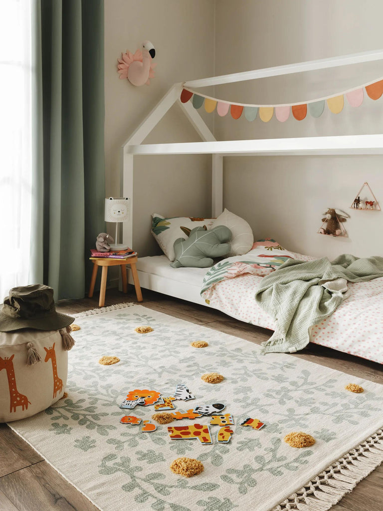 Pour apporter du contraste et du dynamisme, n'hésitez pas à jouer avec des coussins colorés, des plaids aux teintes vives ou des éléments dorés qui ajouteront une touche de caractère et de personnalité. Le tapis crème agit comme une toile vierge : il accueille toutes les idées créatives et permet de faire évoluer facilement la décoration au gré des envies, des saisons ou de la croissance de l'enfant.