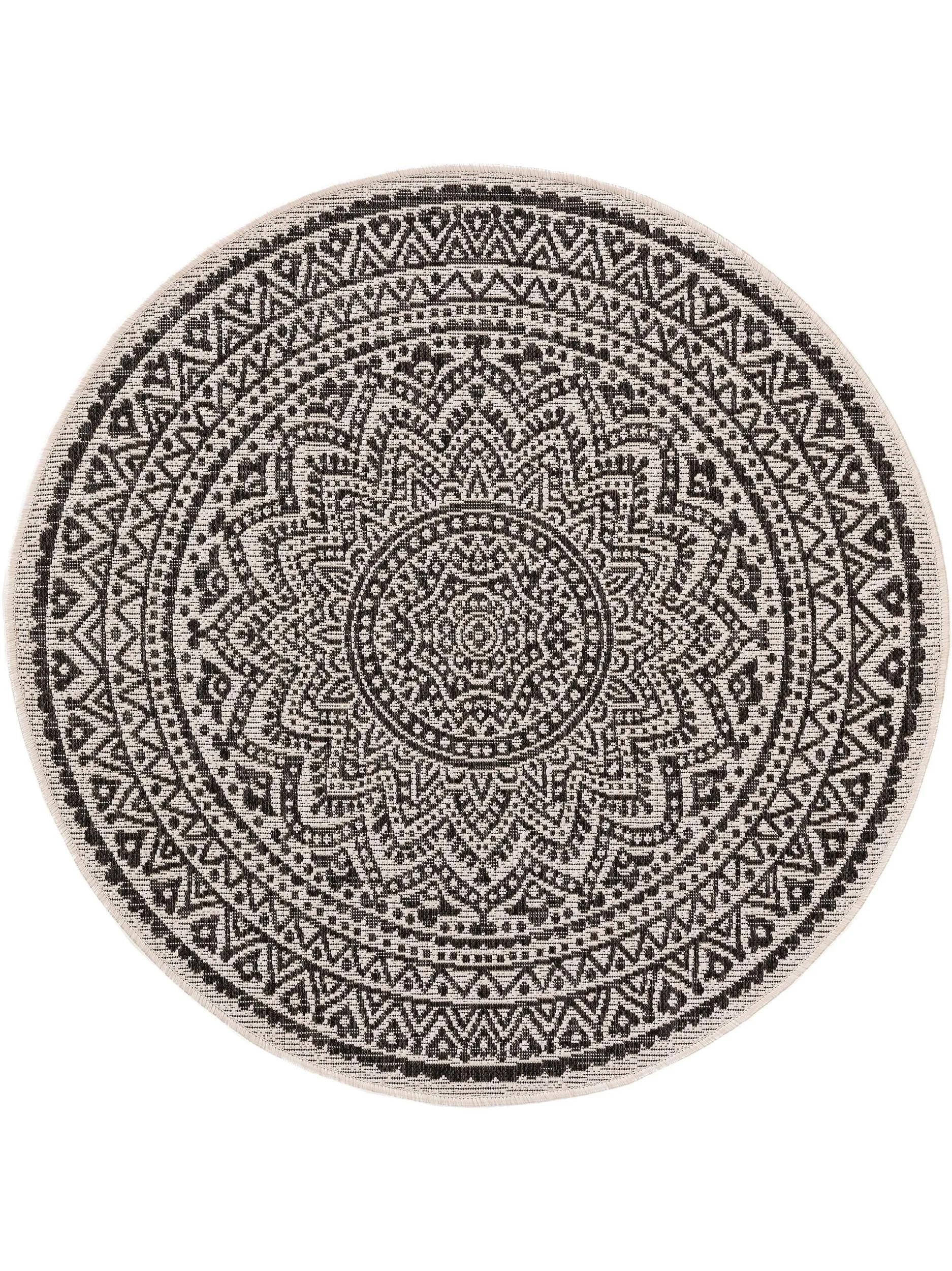 Tapis bohème motif mandala rond blanc et noir d'intérieur et d'extérieur 150 cm de diamètre