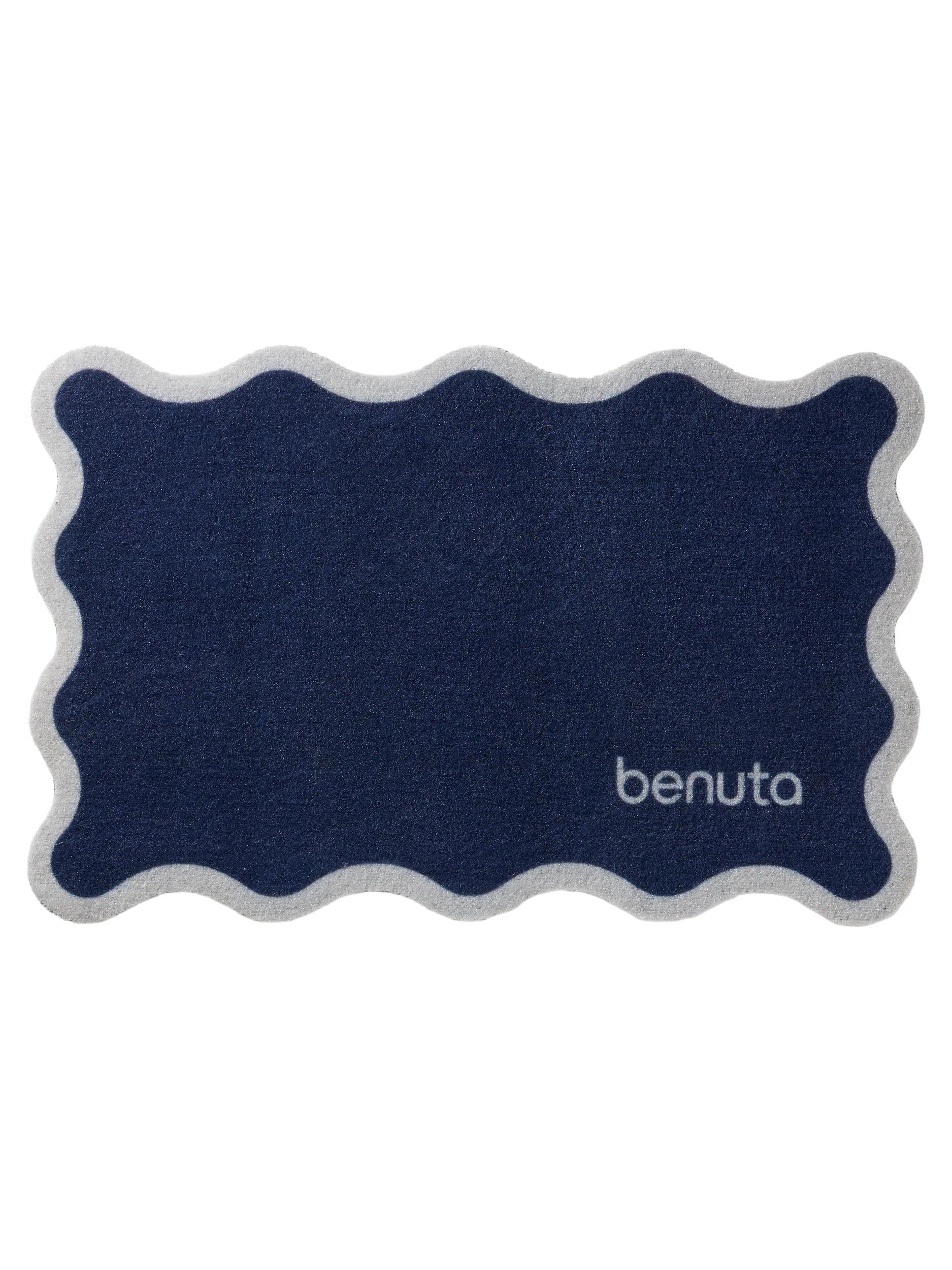 Les formes inspirées du motif en vague apportent un mouvement discret, comme un souffle horizontal qui guide le regard vers l’intérieur. Les courbes fluides dialoguent avec la géométrie de l’espace, créant un contraste harmonieux entre rythme et calme. La déclinaison chromatique en bleu reste maîtrisée, jouant sur les nuances pour donner de la profondeur sans saturer.