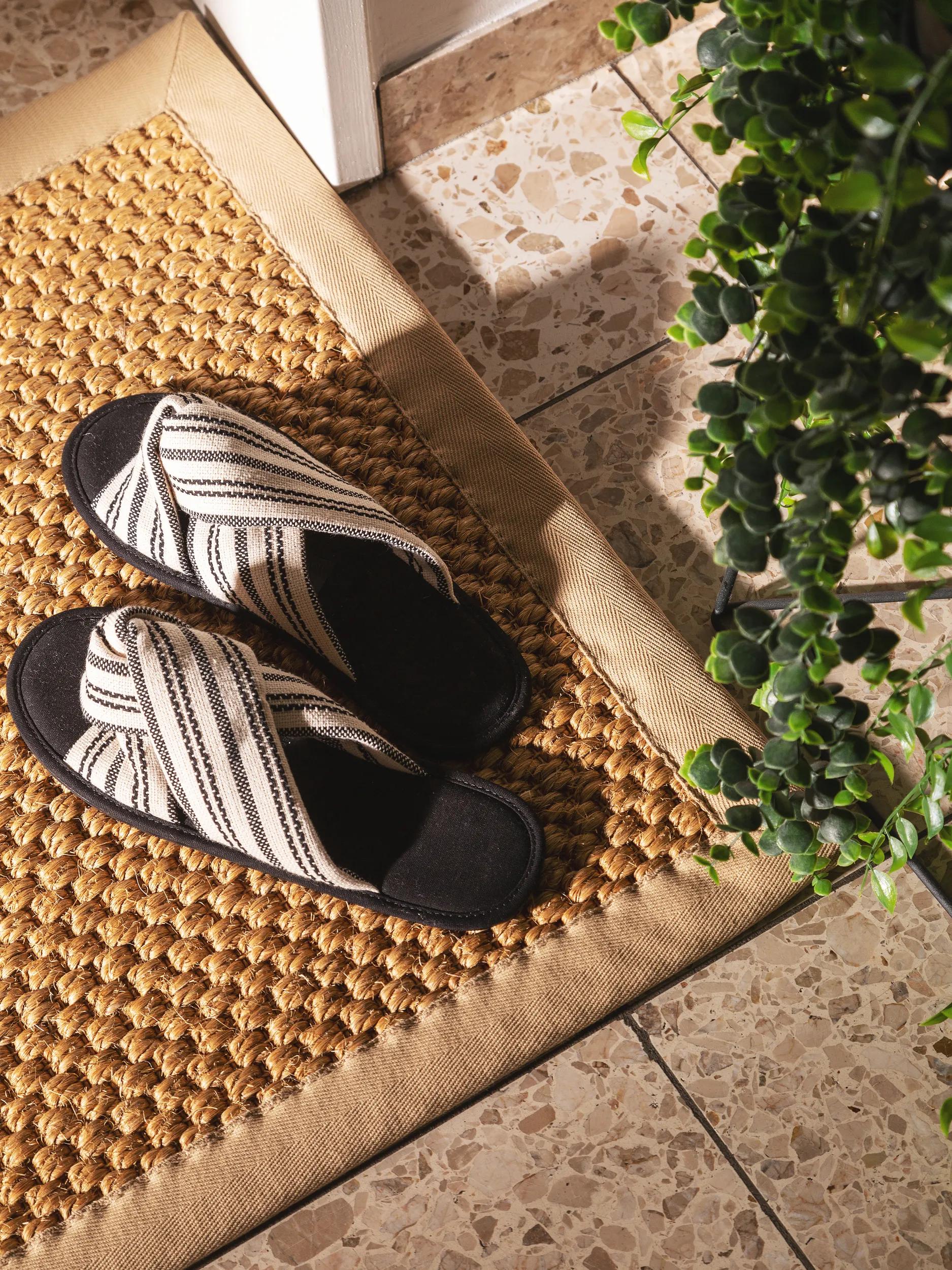 En format réduit, ce paillasson trouve sa place face à une porte ou devant un meuble bas, délimitant une zone d'accueil avec discrétion. La dimension 40x60 cm est pensée pour recentrer un vestibule, accompagner un banc en bois clair ou souligner un petit coin lecture, sans empiéter sur la fluidité du passage.