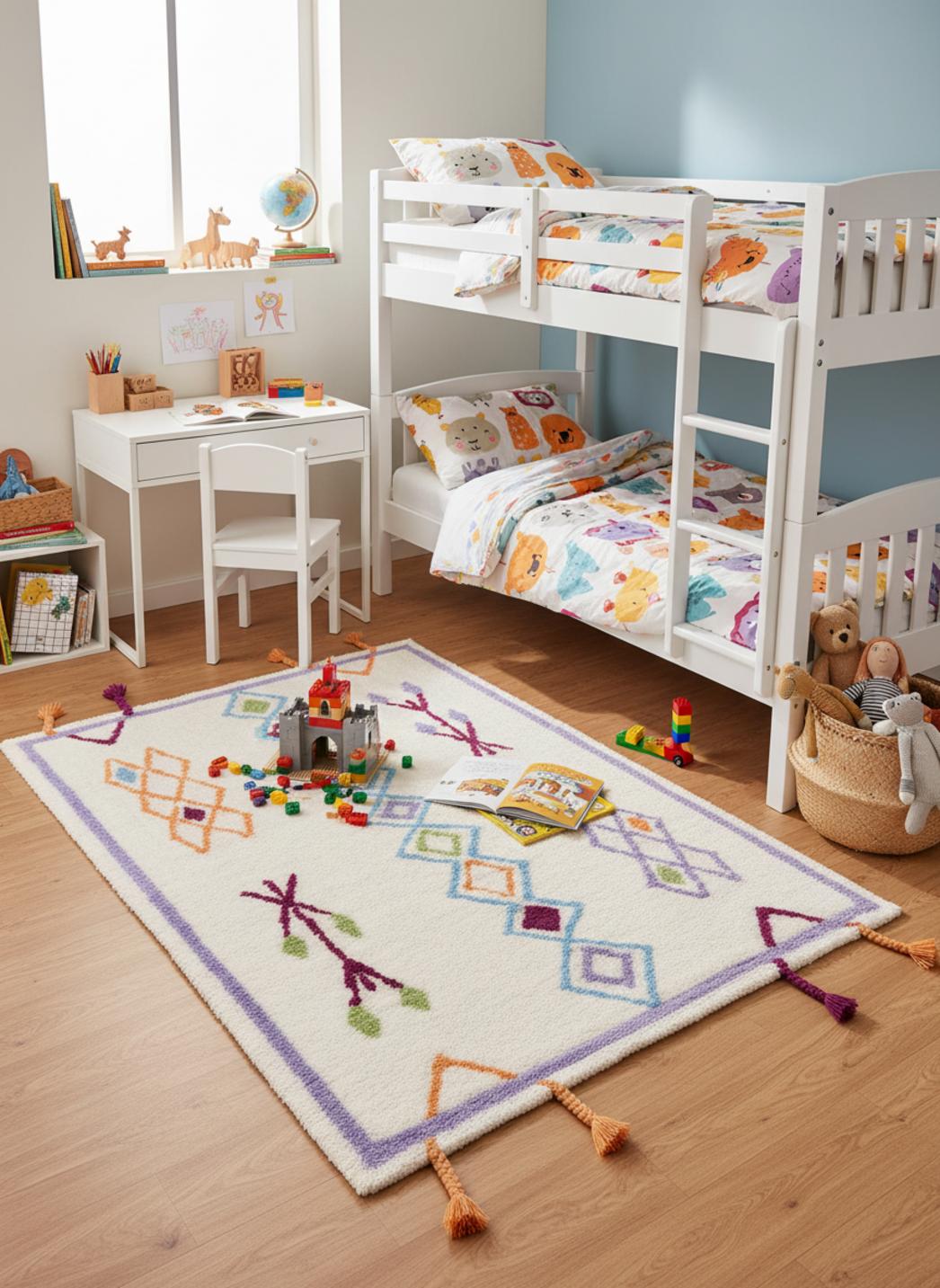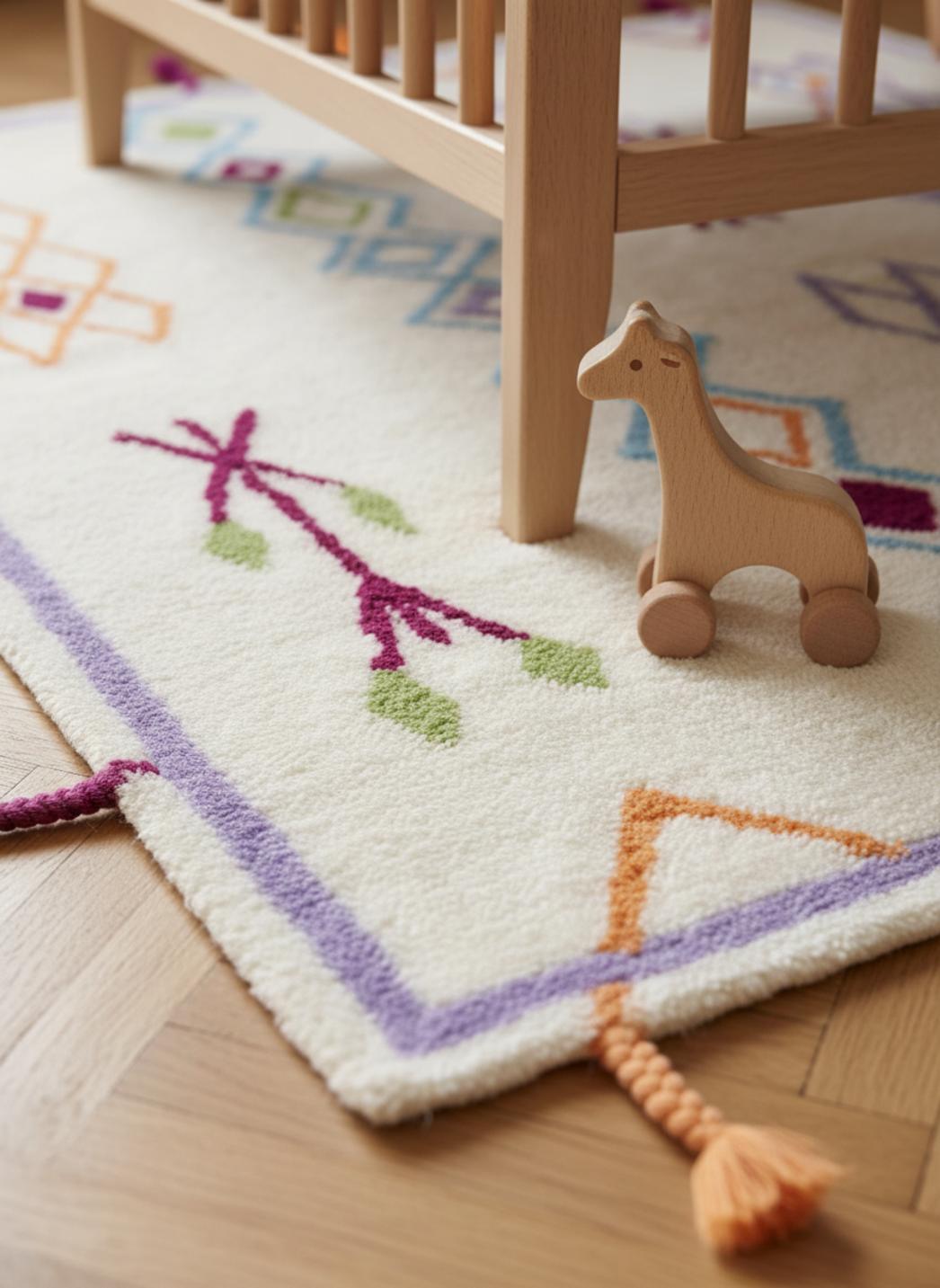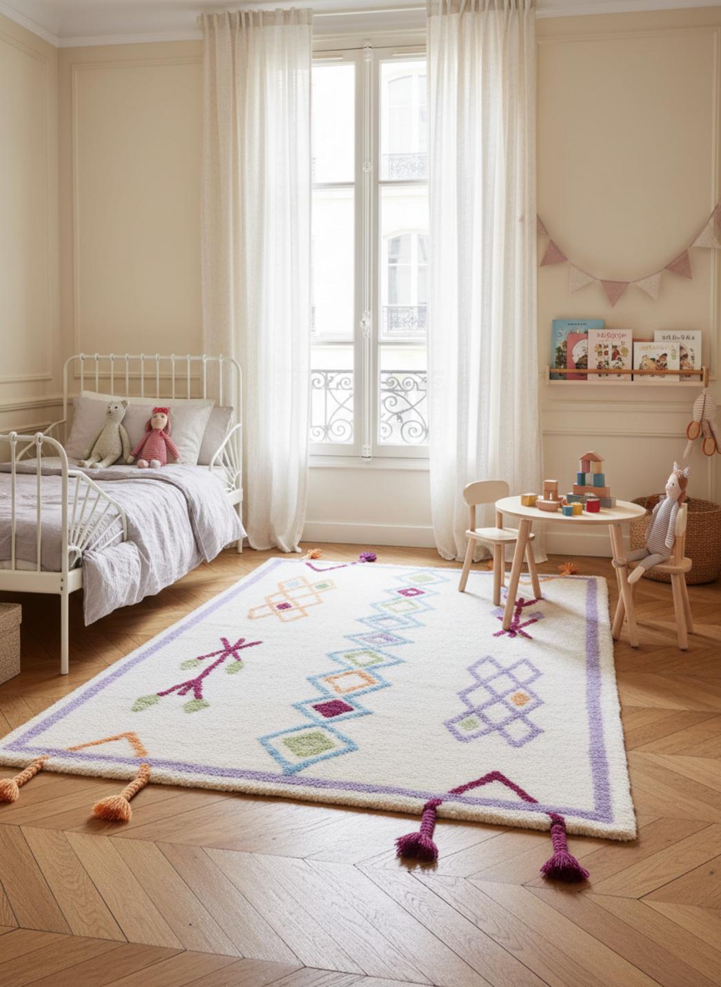 Au réveil, la chambre s’éveille doucement autour d’un tapis qui invite au calme et à l’imaginaire : des touches violet profondes se mêlent à des teintes multicolore qui stimulent la curiosité sans troubler le repos. La lumière du matin glisse sur la surface et transforme chaque moment au sol en une petite scène chaleureuse, idéale pour les lectures du matin ou les jeux tranquilles avant la sieste.