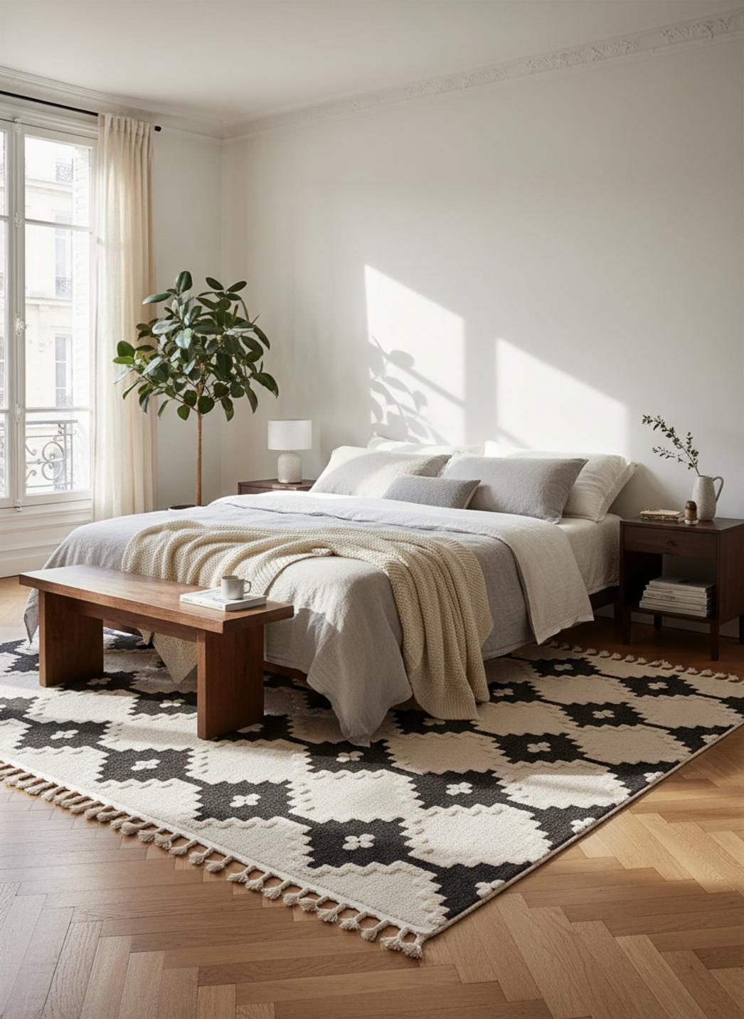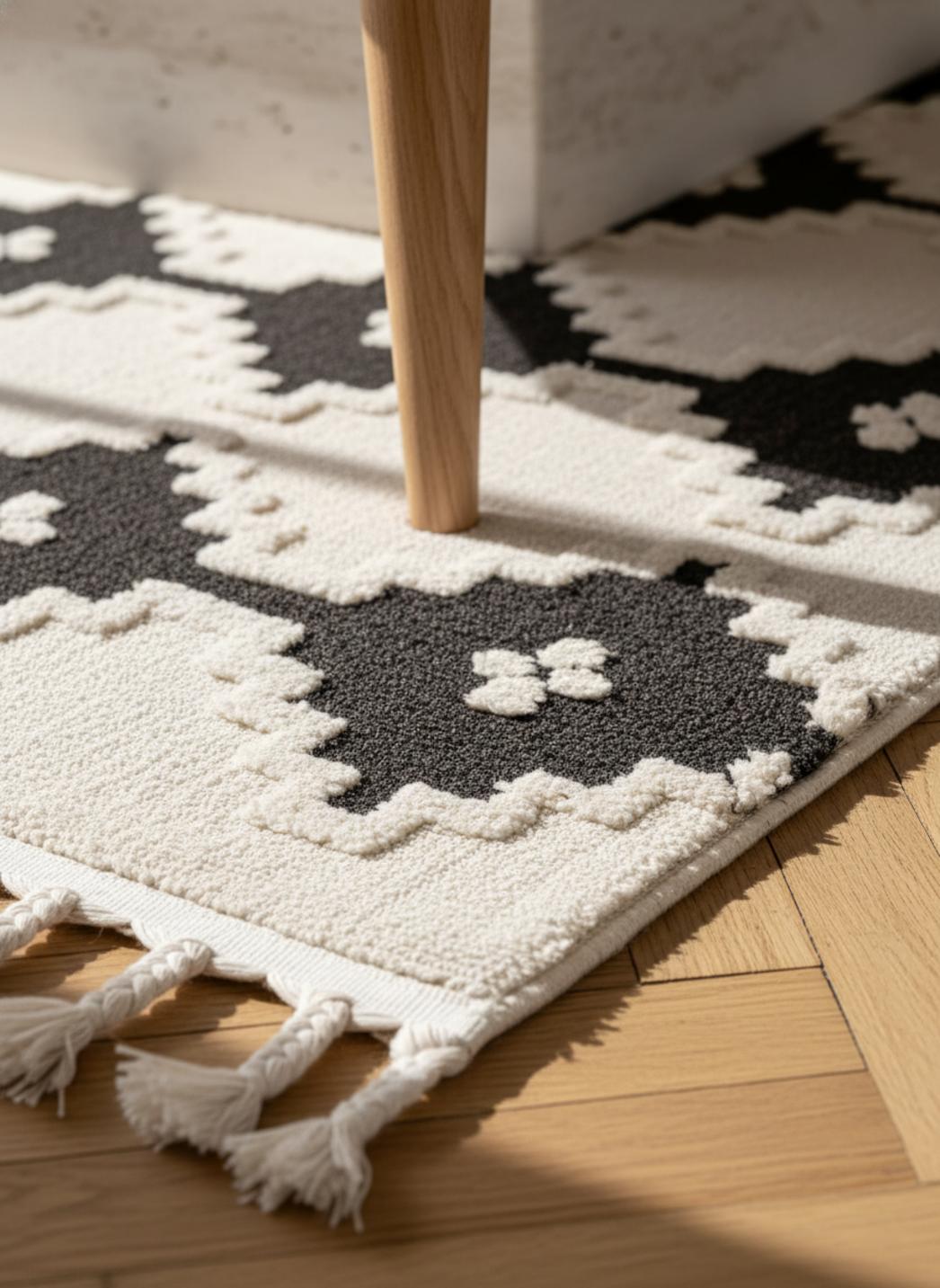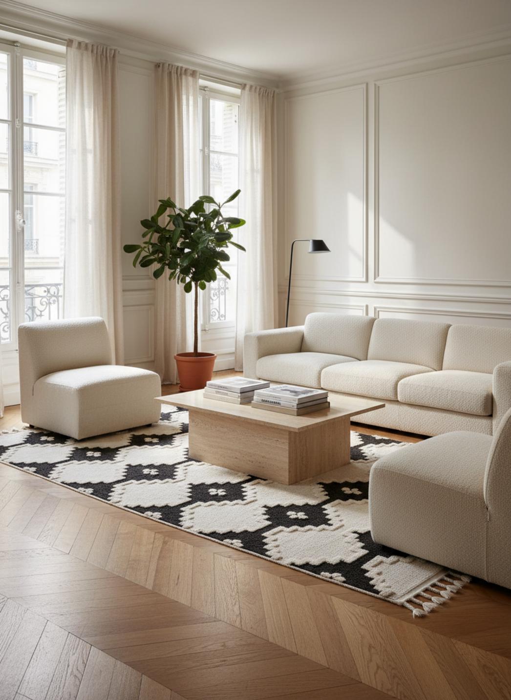 Imaginez un sol qui raconte une histoire douce, inspirée des ateliers marocains, où le travail artisanal se lit à travers des losanges et des lignes imparfaites, un hommage discret au style berbère qui respire authenticité et modernité, posé sur un fond lumineux aux nuances de beige rehaussées de touches graphiques noir.