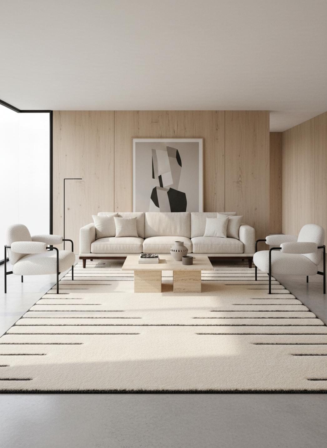 La mise en scène se fait douce et familière, évoquant la sensation sous les pieds d'un dimanche paresseux, la moelleux qui accueille un pas encore ensommeillé et la chaleur qui atténue l'air du soir. Placé devant un lit ou au pied d'un grand canapé, le format 250x350 cm crée une zone de vie généreuse, complice des repas en famille et des moments de calme.