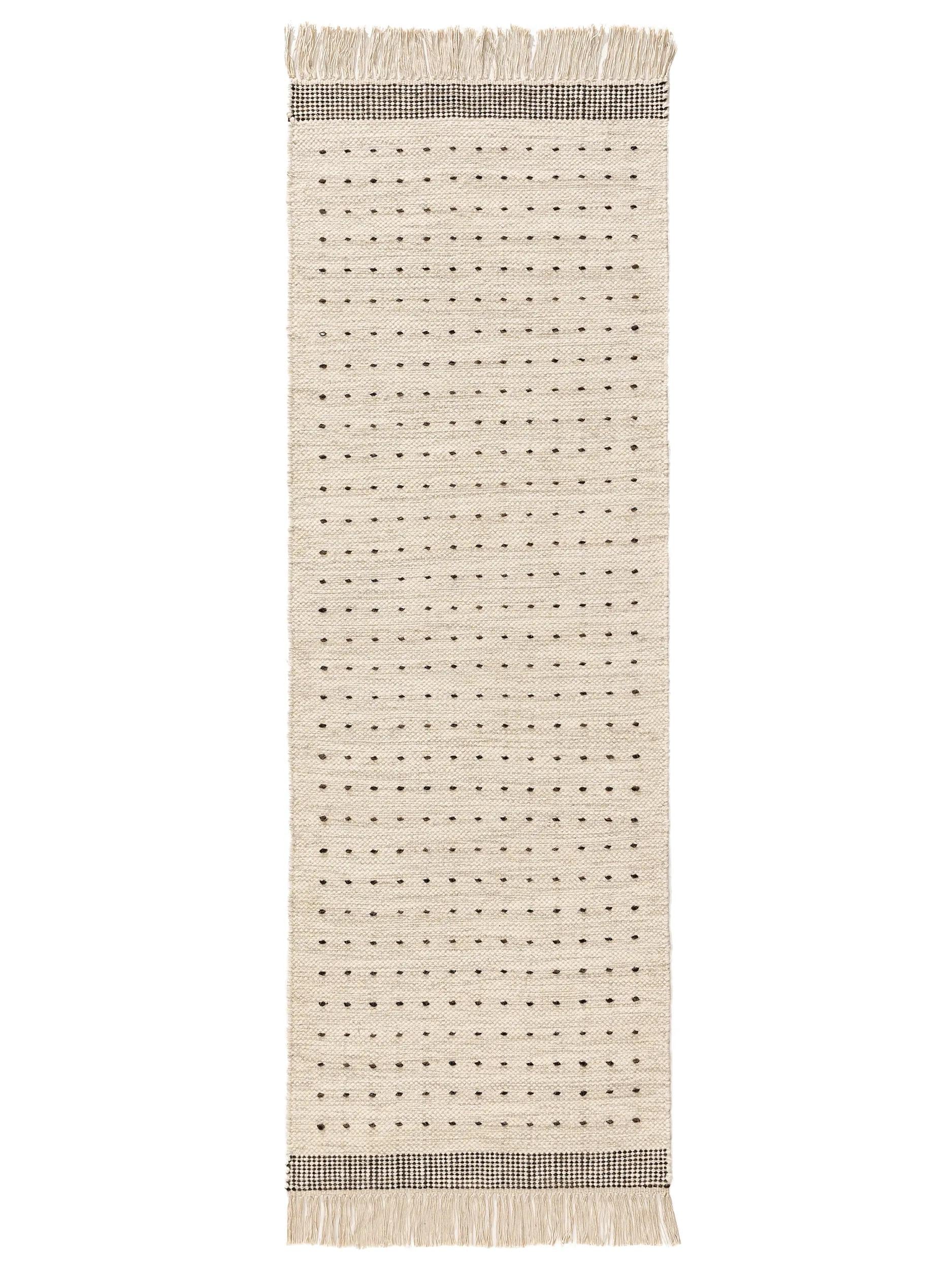 Évocant les tapis de tradition, les motifs s’organisent en losanges et en lignes légèrement irrégulières, offrant ce contraste graphique si reconnaissable. Les traits noir dessinent des figures qui respirent sur un fond clair où le blanc apporte cette luminosité subtile qui calme la pièce, créant un motif qui semble tissé par la mémoire et non par la règle.