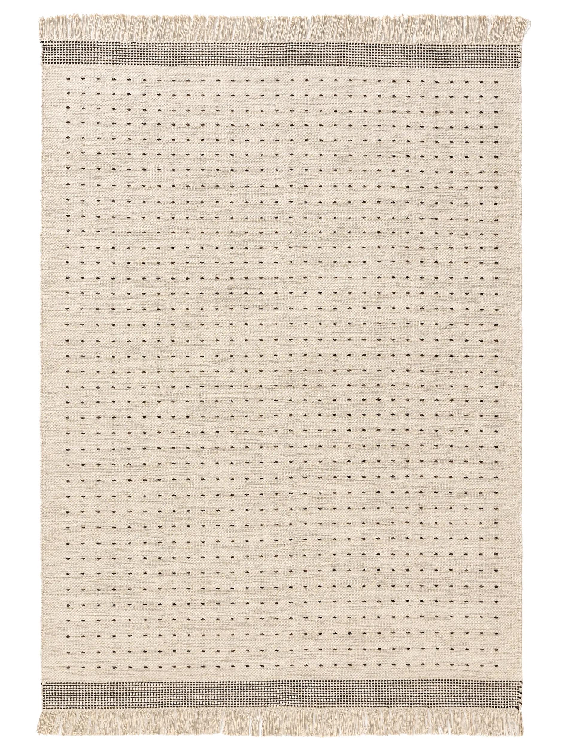 Les motifs reprennent l’esthétique des tapis Beni Ouarain, avec des lignes noires qui flottent sur un fond clair et des losanges qui rythment l’ensemble, apportant ce mélange d’imparfait assumé et d’équilibre visuel. Chaque irrégularité montre l’empreinte d’un travail artisanal, tandis que la palette bicolore conserve une élégance apaisée et contemporaine.