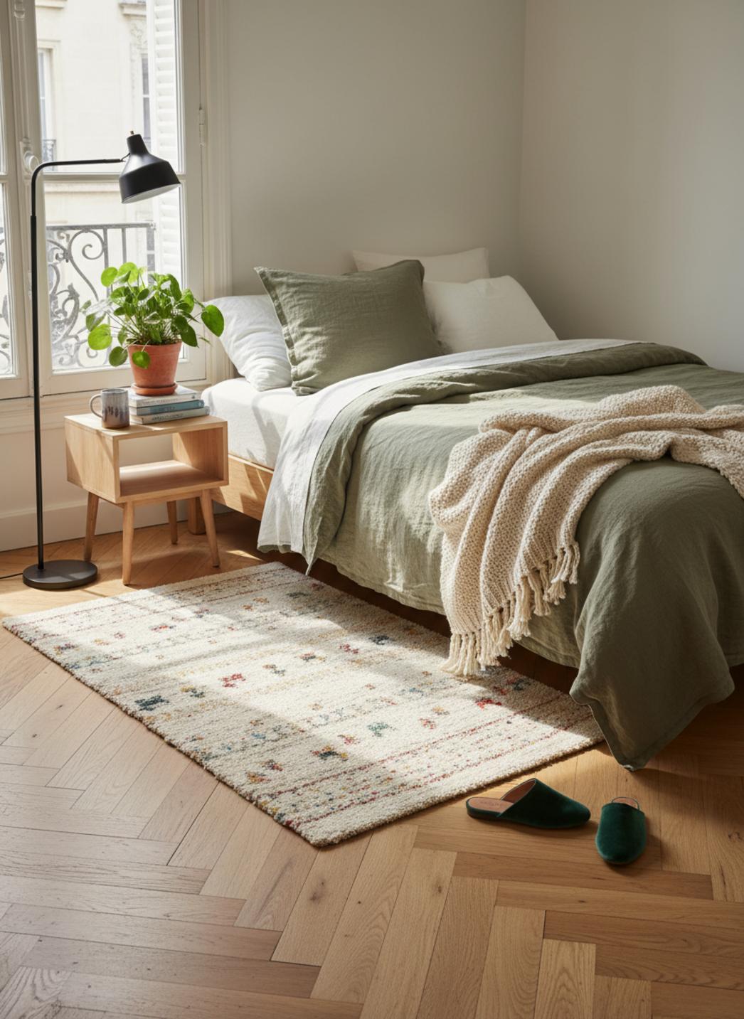 La structure du décor est pensée pour accompagner le mobilier : une table basse délicate ou un petit canapé se dessinent autour de la pièce et le tapis devient un point d’ancrage. Dans une chambre lumineuse, il souligne la longueur du lit et apporte cette caresse sous les pieds au réveil. Les dimensions 80x150 cm s’imaginent parfaitement devant un canapé deux places ou en pied de lit, créant une zone intime sans surcharger l’espace.