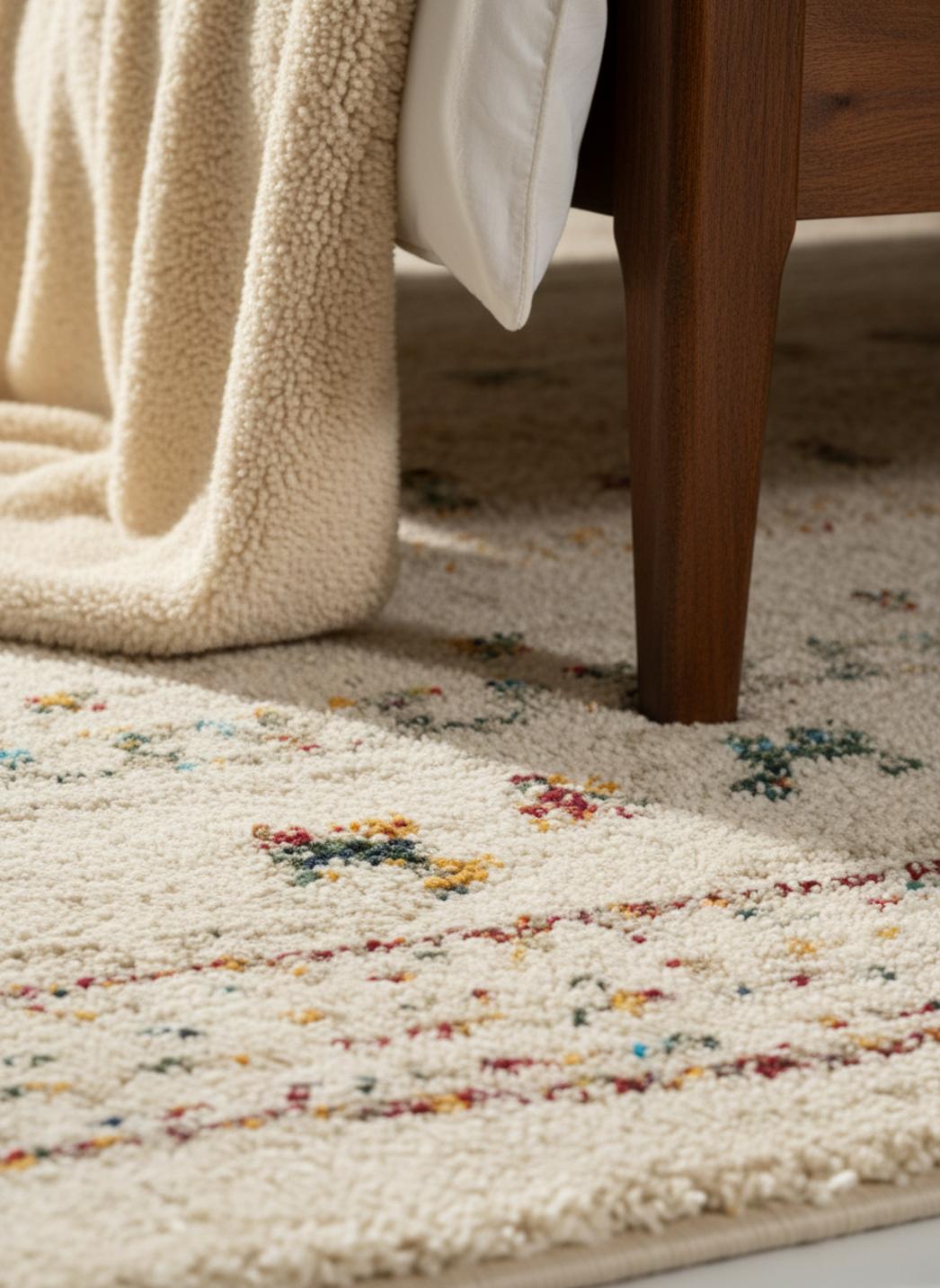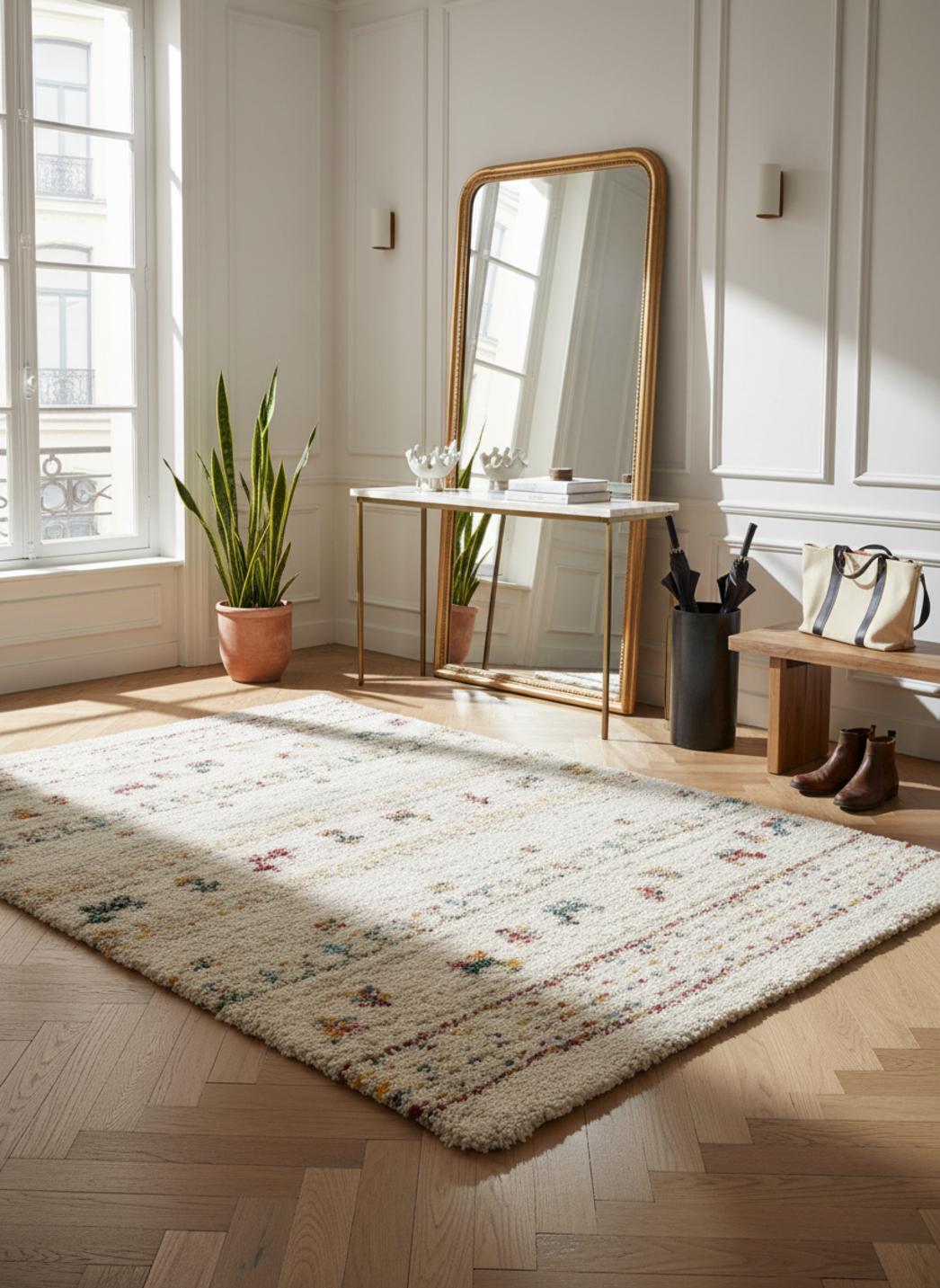 Au cœur d’un intérieur baigné de lumière, la finesse d’un tapis rappelle la douceur des maisons marocaines revisitées, où les lignes tissent une histoire. La présence de berbère se perçoit dans chaque motif comme une mémoire délicate, tandis que des teintes beige posent une lumière chaude et apaisée. Les effets multicolores se glissent avec discrétion, évoquant une palette vivante sans jamais rompre l’harmonie, et le toucher invite à s’asseoir, à se laisser envelopper.