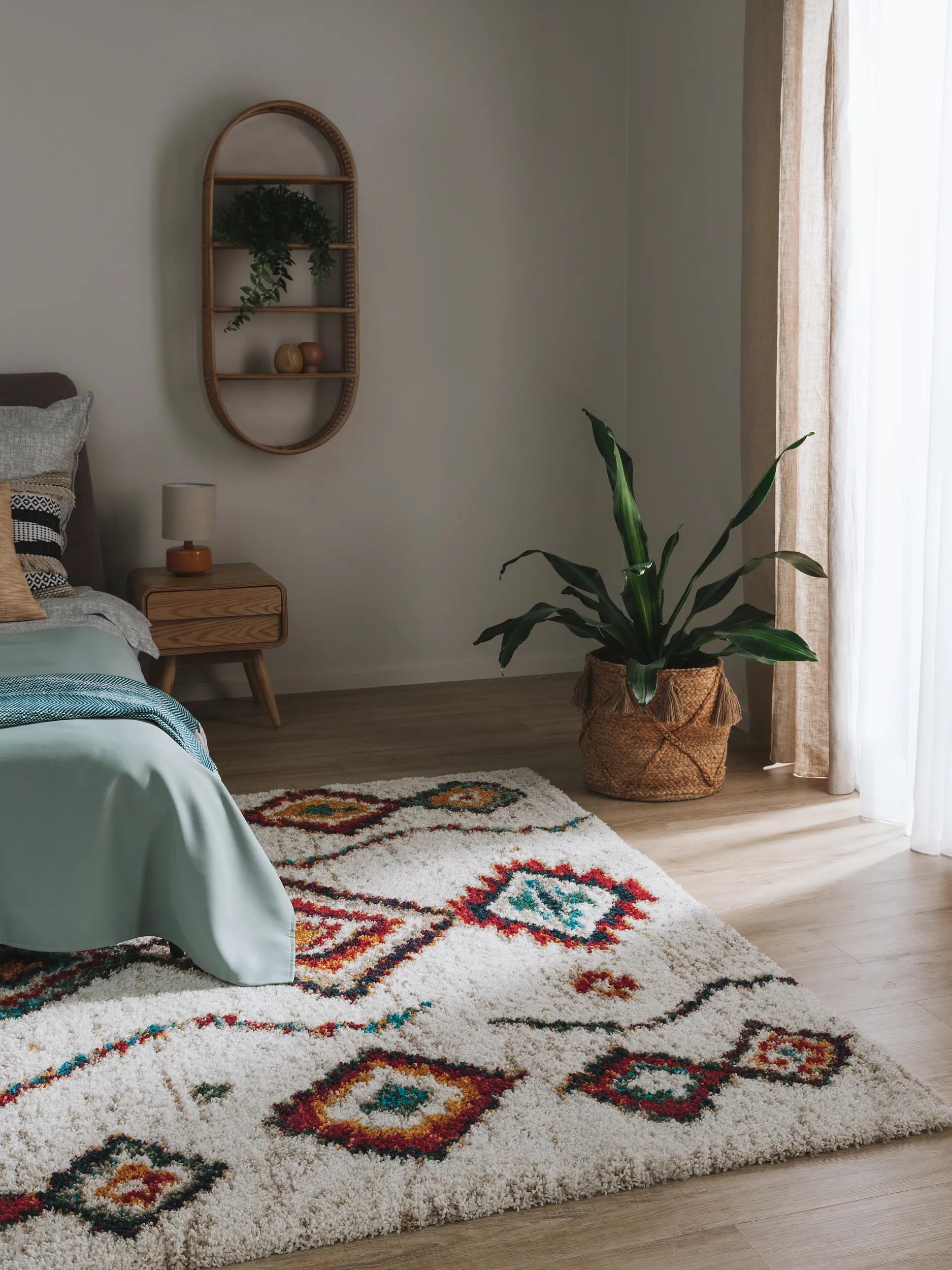 Chaque détail décoratif trouve sa place : bois blond, panier en rotin, lin froissé et lumière du matin se combinent pour créer un tableau vivant où le tapis joue le rôle d'ancrage, réchauffant la pièce et proposant un contraste graphique délicat.