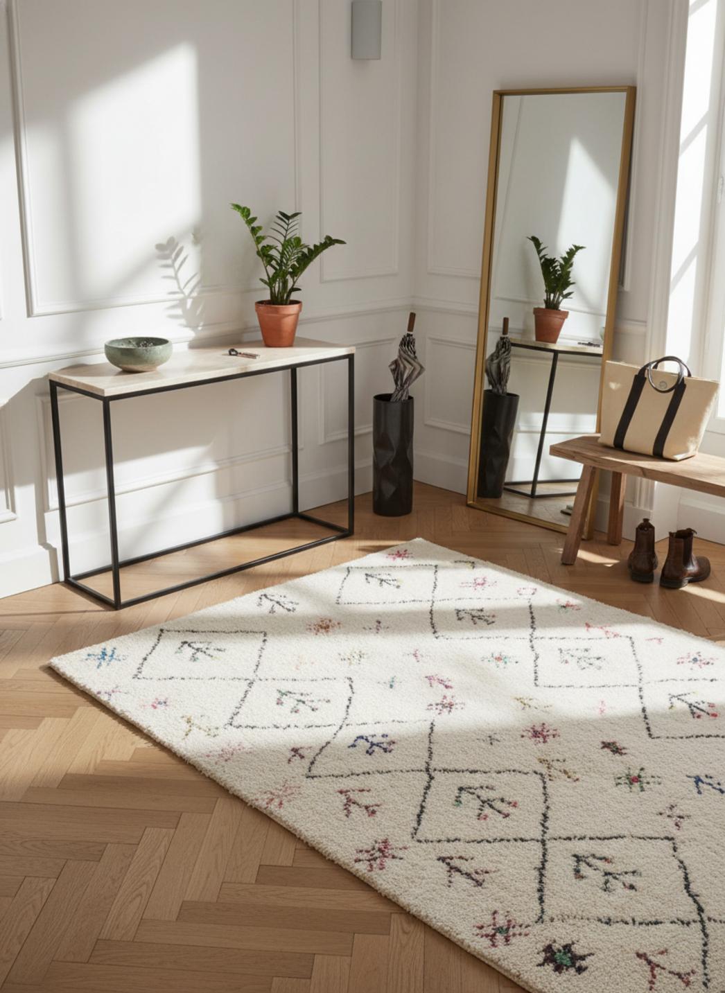 On imagine ce tapis posé sur un parquet en bois clair, entouré de meubles en rotin et de tissus en lin, créant un tableau apaisant où la lumière naturelle joue sur les fibres. Le contraste subtil entre la surface claire et les touches colorées donne à la pièce une respiration chaleureuse, invitant à la convivialité familiale.