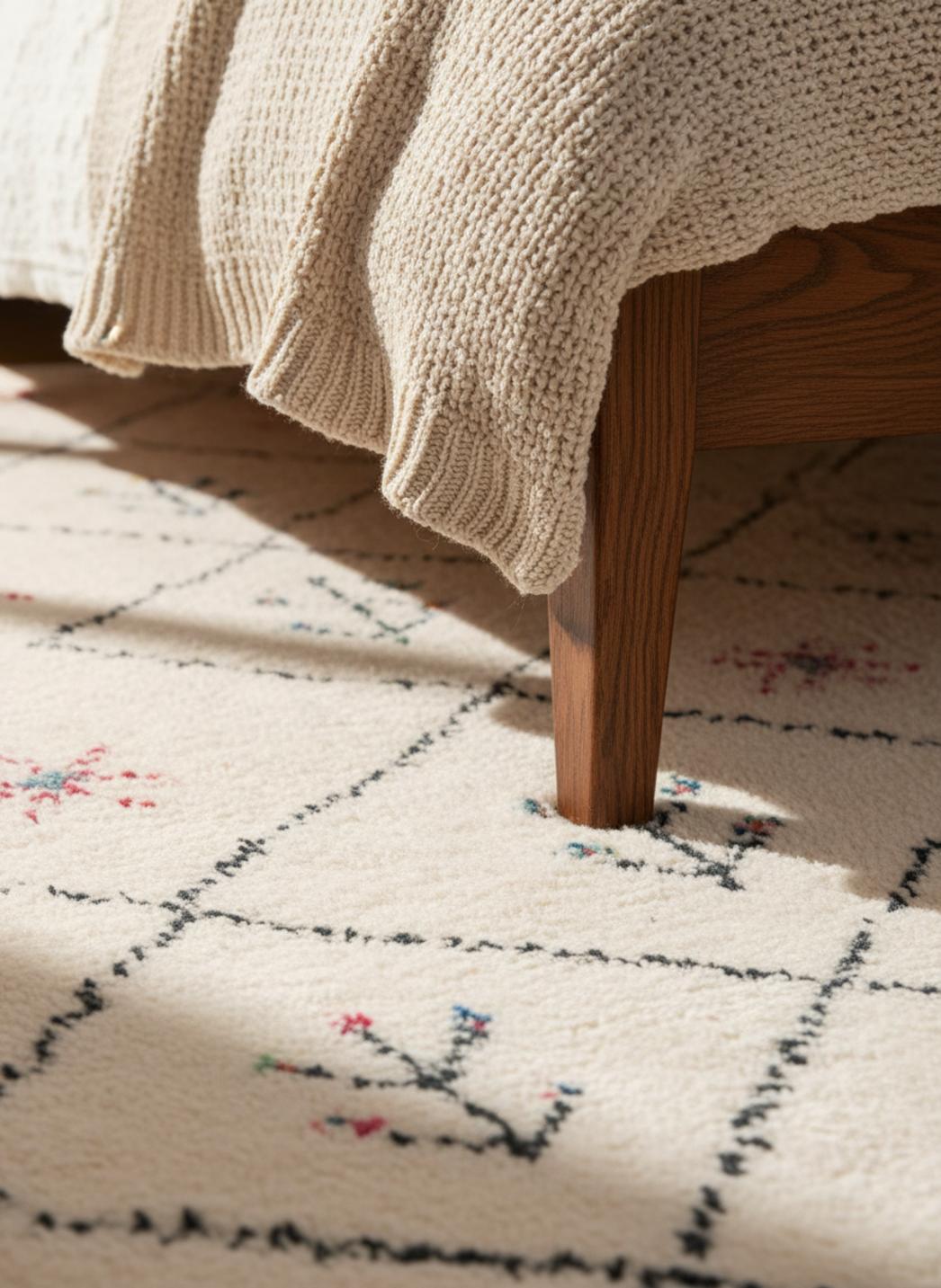 Autour d’un coin lumineux, la douceur d’un tapis inspiré du savoir-faire berbère s’impose avec délicatesse, un fond lumineux qui rappelle la simplicité d’un sol ensoleillé et la caresse d’un doux matin. Le voile principalement blanc laisse respirer l’espace, invitant à la lenteur et au plaisir discret des textures au toucher.