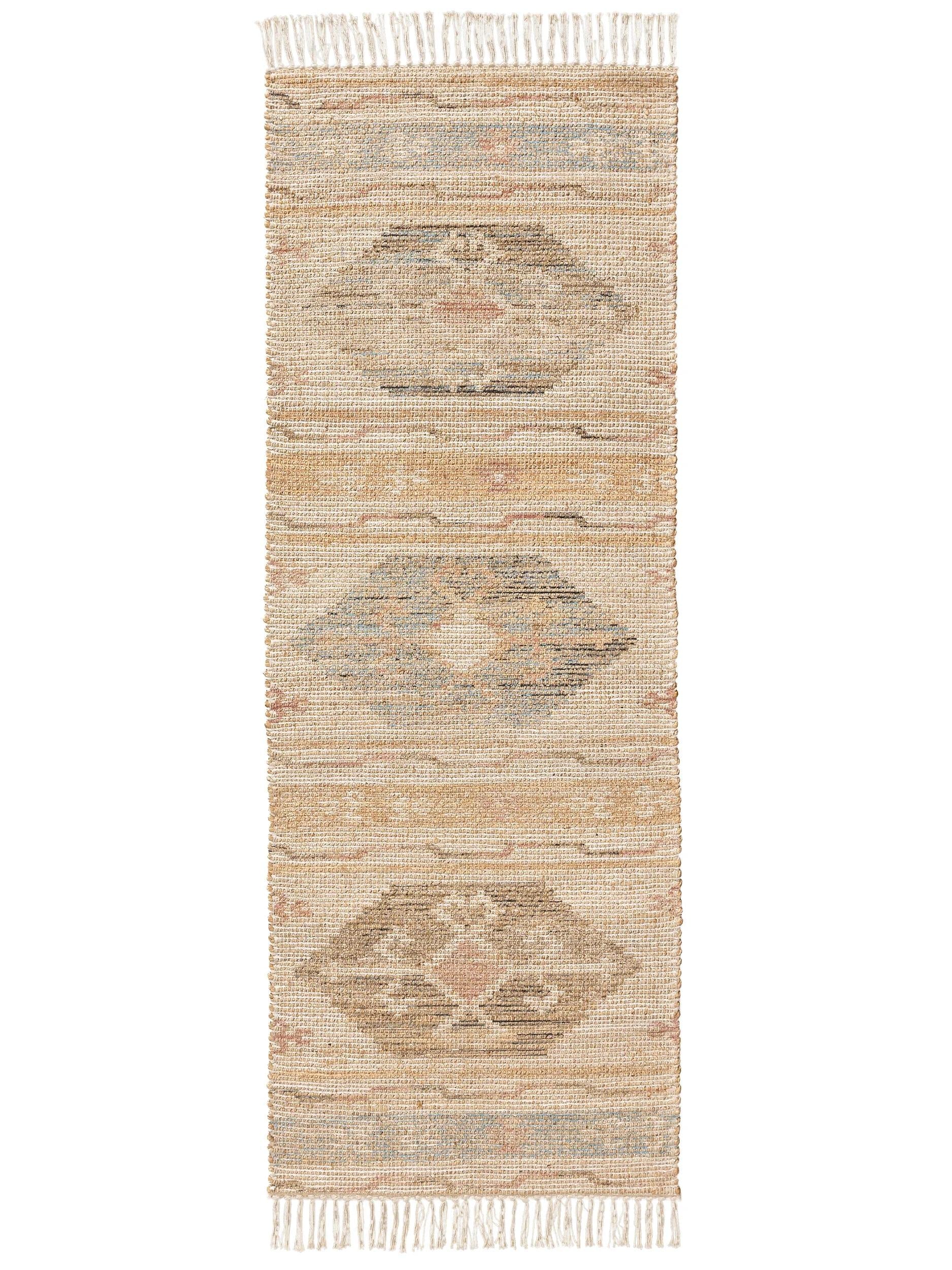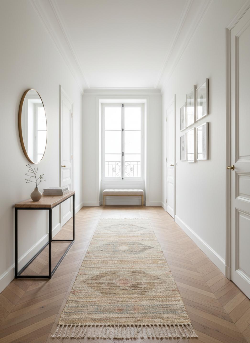 Dans un couloir, ce tapis devient un fil conducteur qui allonge la perspective et réchauffe les pas. Sa palette met en valeur des nuances intenses où l'orange apporte une note solaire, comme une tache de lumière qui rayonne au cœur du passage, invitant à ralentir et à apprécier le détail du tissage.