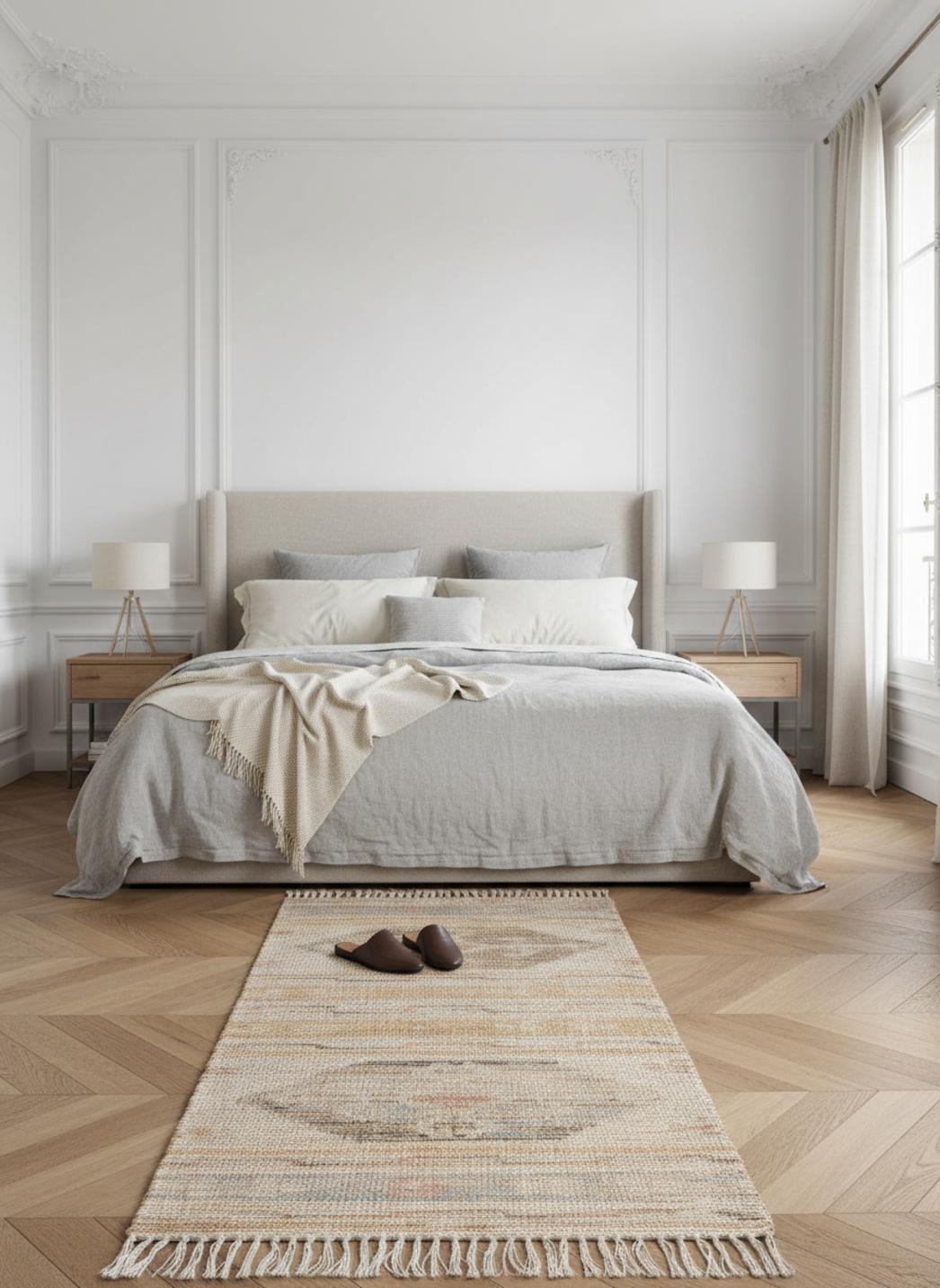 Sous la lumière douce d'une fenêtre, un tapis raconte une histoire d'inspiration berbère, où les motifs semblent tissés au rythme du souffle du désert et de l'atelier. La texture appelle la paume du pied, promettant une présence chaleureuse qui transforme un salon en un refuge bohème, ponctué de bois blanchi, de rotin et de lin clair.