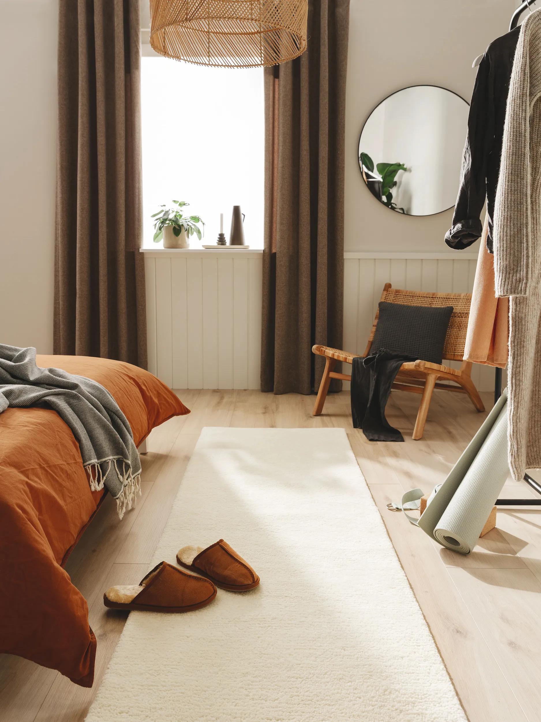 Autour de cette simplicité, la laine révèle toute sa chaleur : un toucher dense, légèrement bouclé, qui épouse la plante des pieds et diffuse une sensation moelleuse, comme un plaid posé au sol, apportant une isolation douce et enveloppante au fil des saisons.