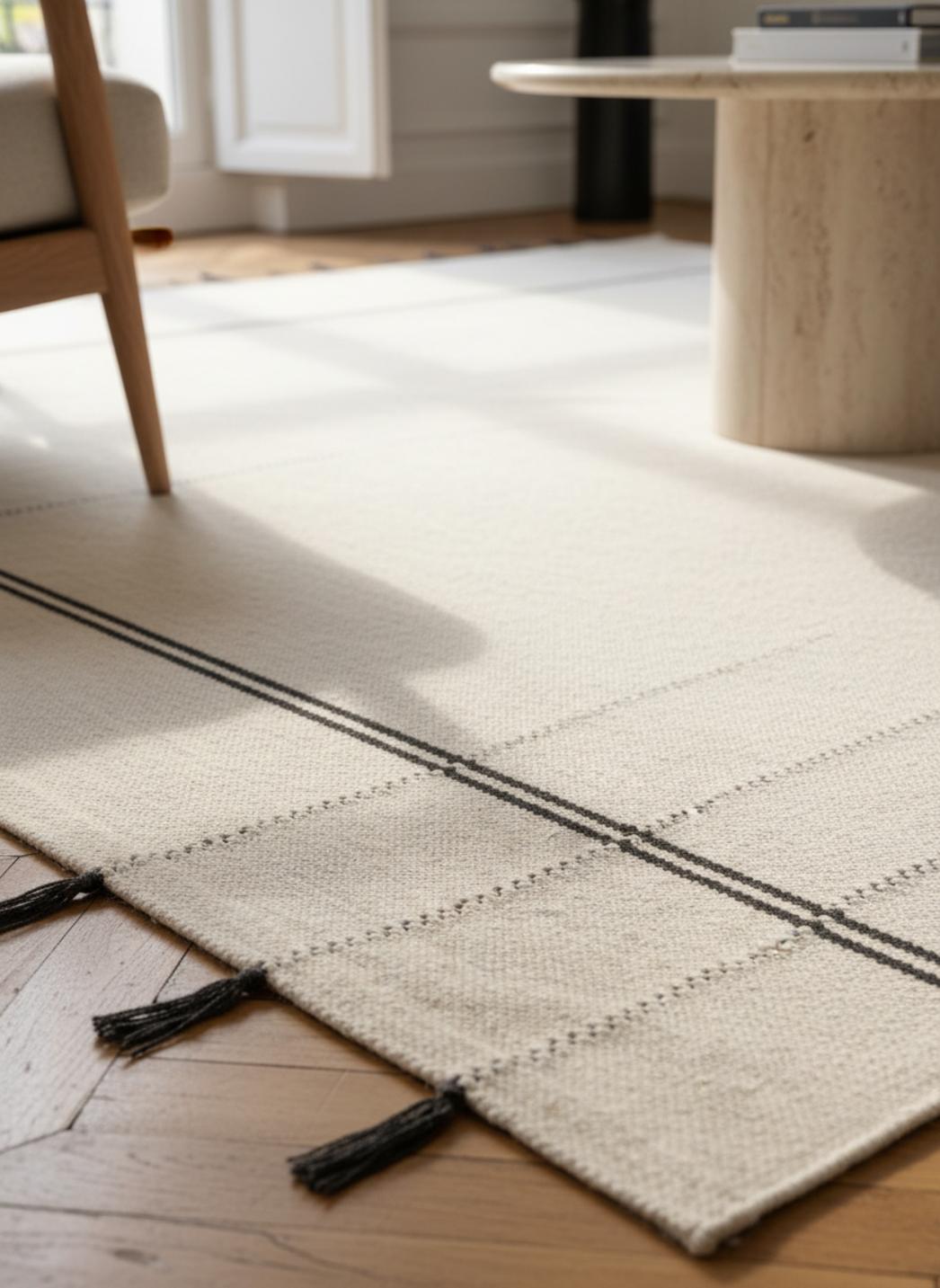 Au cœur de la décoration, ce tapis incarne une douceur visuelle aux accents nomades, où l’élégance bohème se marie à des contrastes sensibles. Les teintes crème et noir dessinent un souffle apaisant qui capte la lumière tamisée, offrant une ambiance chaleureuse et une présence rassurante sans jamais écraser la pièce.