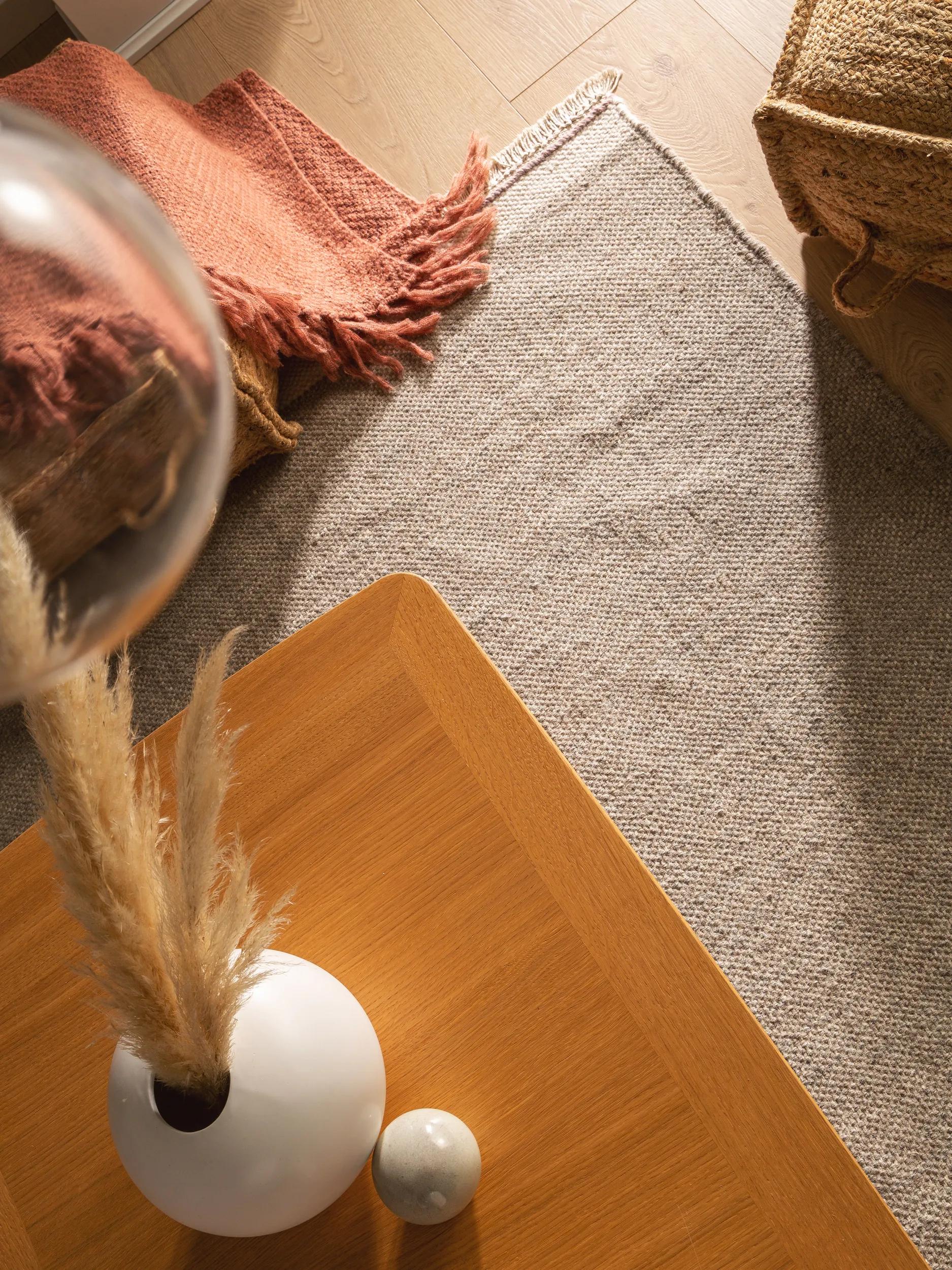 La matière révèle une texture veloutée, pensée pour être accueillante sous les pas, avec une densité qui tient chaud sans écraser la légèreté de la pièce. Les fibres évoquent la solidité et la finesse à la fois, offrant une sensation de confort contemporain adaptée à un intérieur soigné et vivant.