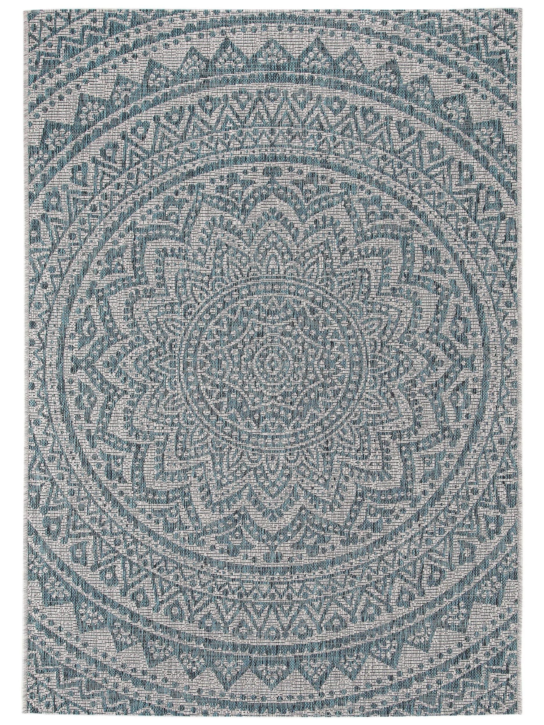 Tapis bohème motif mandala beige et bleu d'intérieur et d'extérieur 140x200 cm