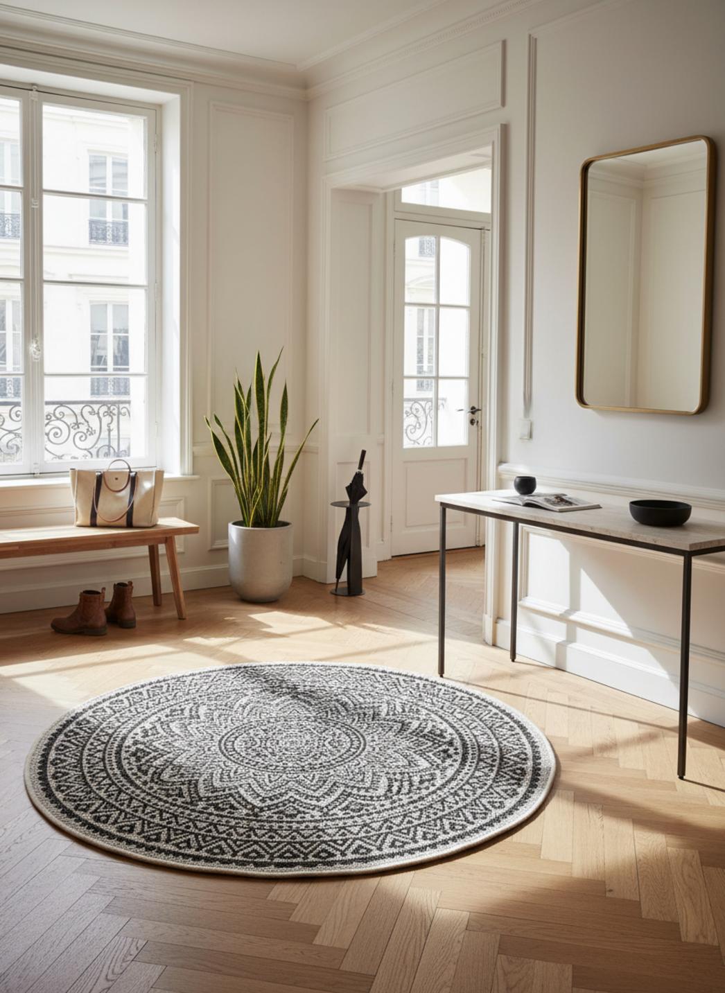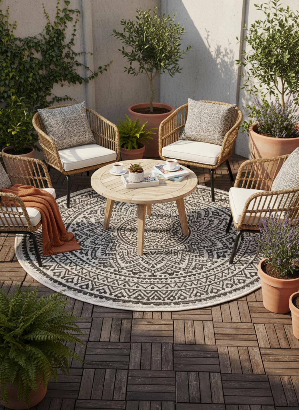 Graphique et raffiné, ce tapis au style bohème séduit par son motif mandala et le contraste saisissant de ses tons blanc et noir. De forme ronde avec un diamètre de 120 cm, il trouve naturellement sa place sur une terrasse, un balcon ou un patio, où il devient un point focal élégant et harmonieux. Son motif mandala, symbole d’équilibre et d’énergie positive, se déploie avec finesse pour créer une composition visuelle captivante, à la fois apaisante et pleine de caractère. Le blanc illumine l’espace tandis que le noir apporte structure et profondeur, formant un duo intemporel et moderne. La forme ronde adoucit les lignes de la décoration, favorisant la convivialité et l’harmonie des lieux. Ce tapis s’accorde parfaitement avec les matériaux naturels comme le rotin, la pierre ou le bois, renforçant un esprit bohème chic et apaisant. Véritable œuvre décorative, il transforme les extérieurs en espaces inspirants, lumineux et empreints de sérénité.
