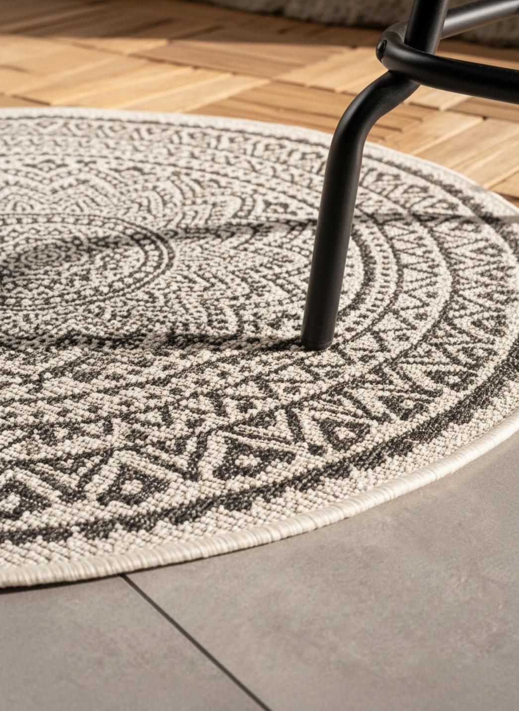 Tapis bohème motif mandala rond blanc et noir d'intérieur et d'extérieur 120 cm de diamètre