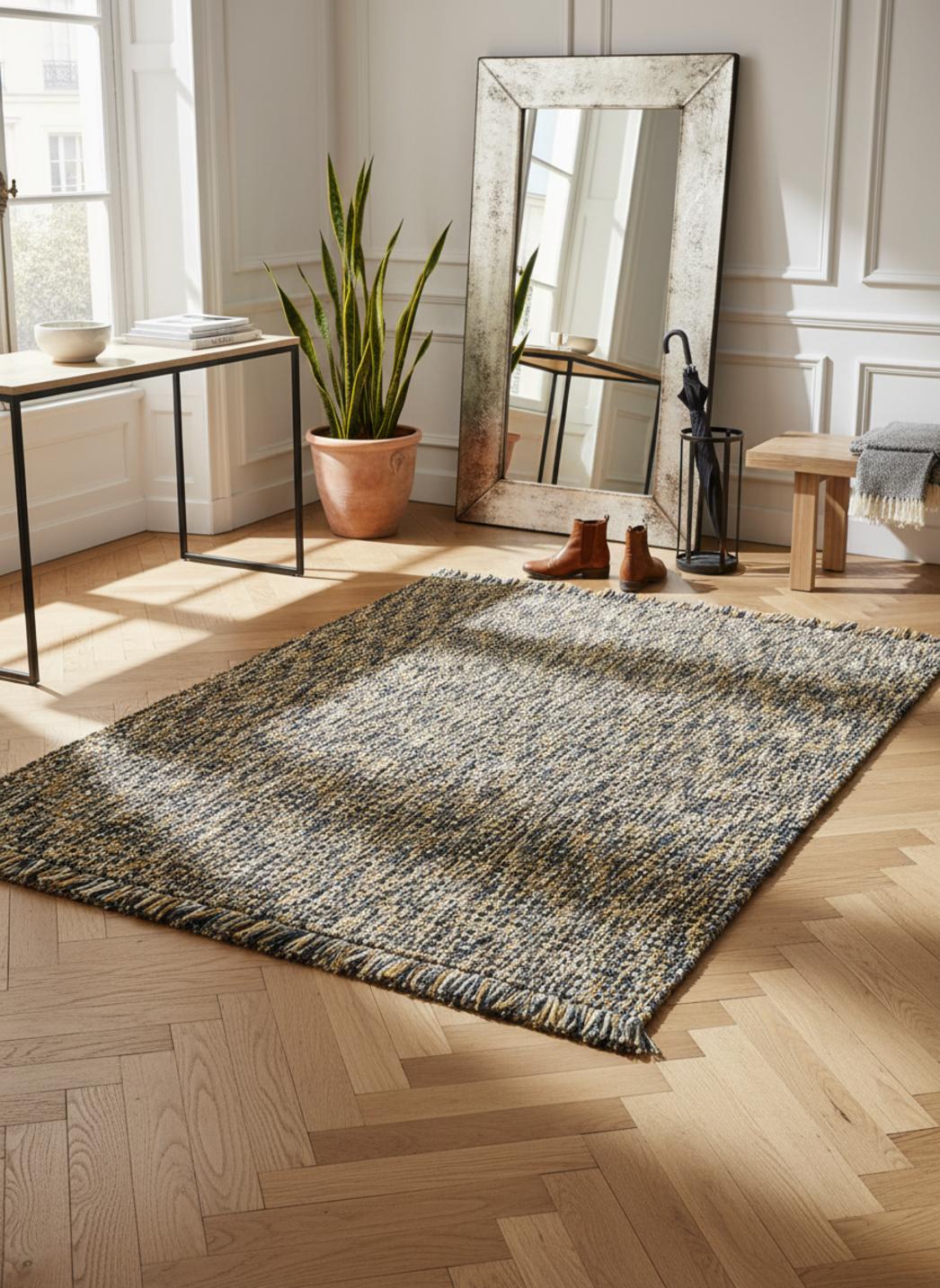 La présence au sol, pensée pour un format sobre et fonctionnel, structure l'espace et définit des zones de vie. Les bords s'achèvent par des franges qui soulignent la silhouette, créant une finition accueillante et rythmée. Installé au pied d'un lit ou sous une table basse, il apporte immédiatement une sensation d'équilibre et de cocon.