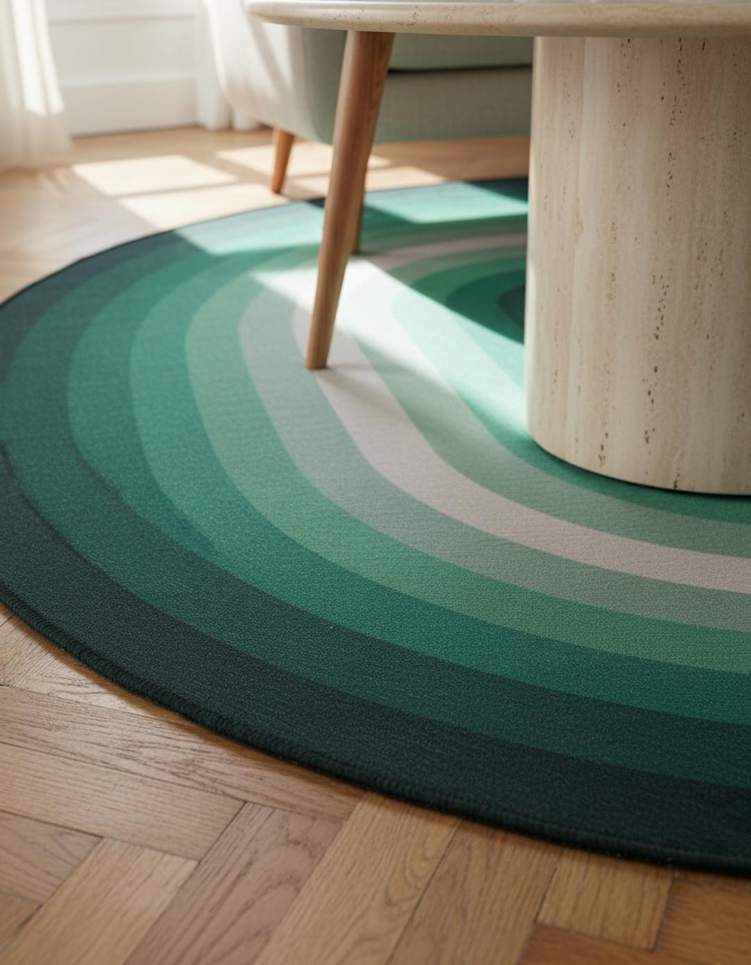 La palette joue un rôle discret et lumineux, où le vert se décline en nuances subtiles et modernes. Le traitement en dégradé apporte mouvement et profondeur sans perdre la retenue, réinterprétant les couleurs en aplats adoucis et transitions nuancées. La silhouette ovale accentue l’effet cocon, offrant un centre visuel accueillant et favorisant la circulation autour des meubles. Cet équilibre chromatique s’adapte aussi bien à un intérieur contemporain qu’à une chambre d’enfant, grâce à une énergie maîtrisée et une palette chaleureuse.