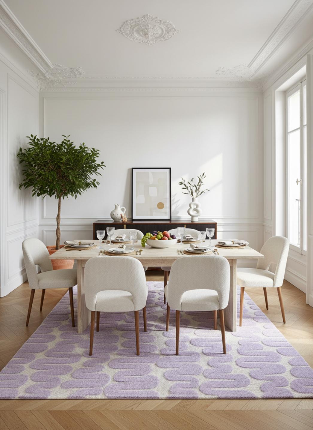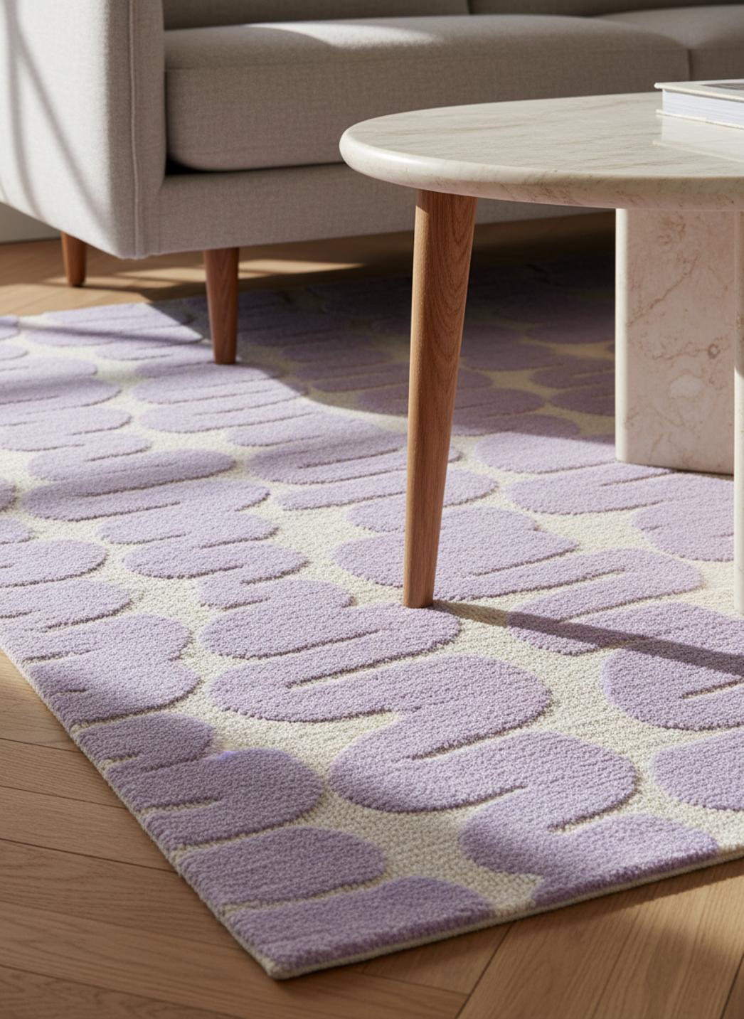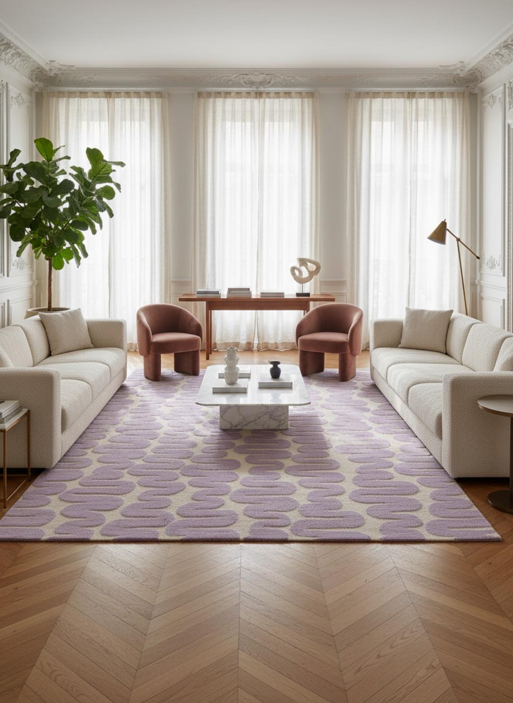 Dans une pièce baignée de lumière douce, ce tapis installe une atmosphère contemporaine où les lignes se font fluides et le regard se pose naturellement. L’équilibre visuel repose sur une simplicité pensée, des contours apaisés et une présence qui valorise meubles et volumes sans jamais les dominer, créant un point d’ancrage chaleureux et discret.