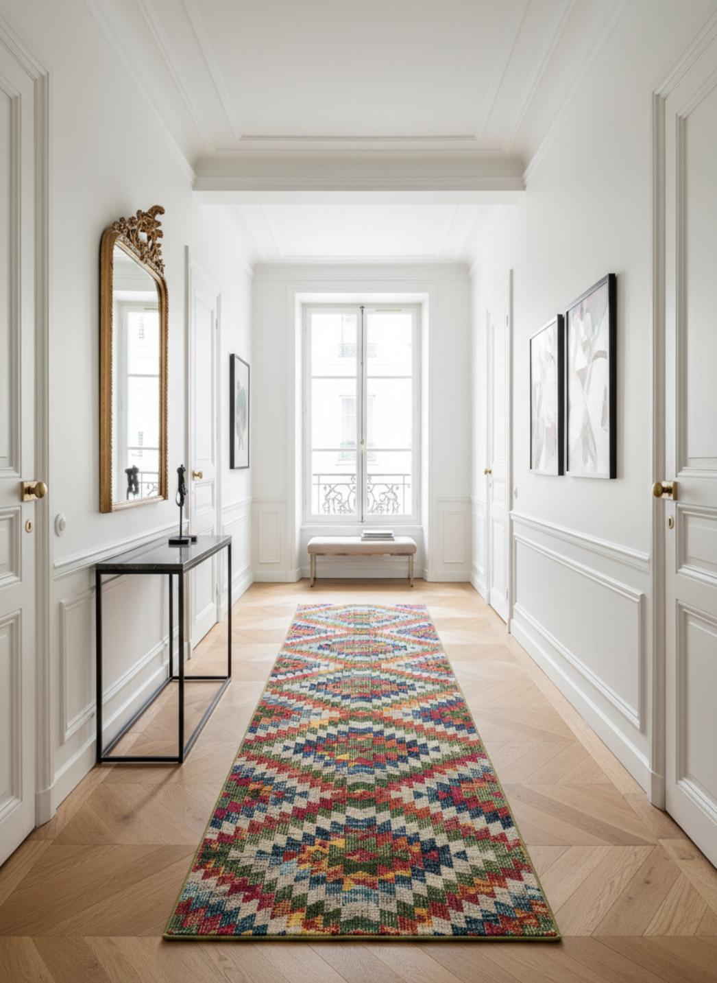 Lignes et lumière se rencontrent pour valoriser l’élancement du couloir, créant une continuité qui guide sans imposer. Le format 70x240 cm s’inscrit naturellement entre meubles et murs, affirmant une présence verticale qui équilibre volumes et proportions et structure la circulation au quotidien.