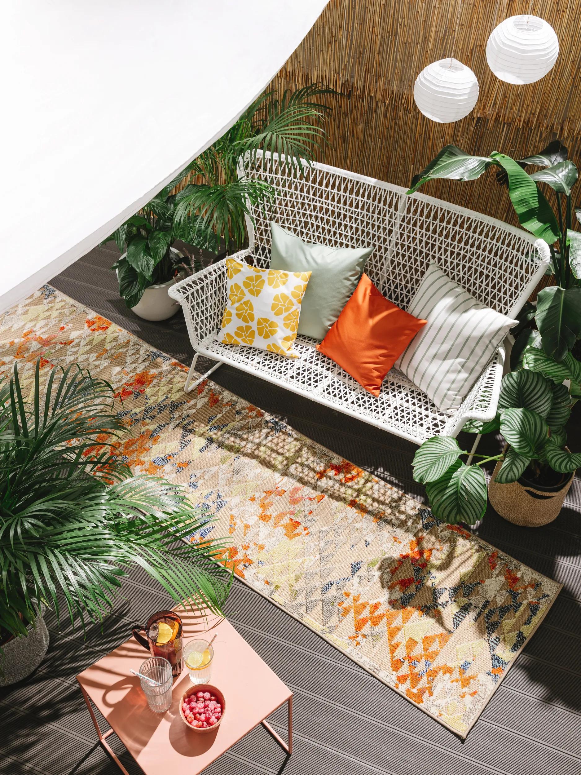 Le long d’un passage ou sur un balcon coloré, le tapis contemporain géométrique à motif triangulaire multicolore insuffle énergie et vitalité à la décoration. Son jeu de triangles, rythmé et précis, crée un mouvement visuel dynamique qui capte la lumière et anime l’espace avec équilibre. Les nuances se répondent avec justesse, mêlant teintes vives et tons naturels dans une composition harmonieuse. En format 80x300 cm, il accompagne la circulation avec fluidité et apporte une touche graphique aux espaces allongés. Ce modèle exprime la modernité vibrante de la collection de tapis d’extérieur, où la géométrie devient un langage de couleur et de contraste. Sa texture tissée à plat révèle de subtils reflets selon l’éclairage, donnant vie au motif à chaque regard. On retrouve cette même dynamique visuelle dans la sélection de tapis de balcon, idéale pour rehausser les espaces étroits d’une note contemporaine et lumineuse. Un tapis qui guide le pas avec gaieté et transforme chaque passage en une allée pleine de rythme et de couleur.
