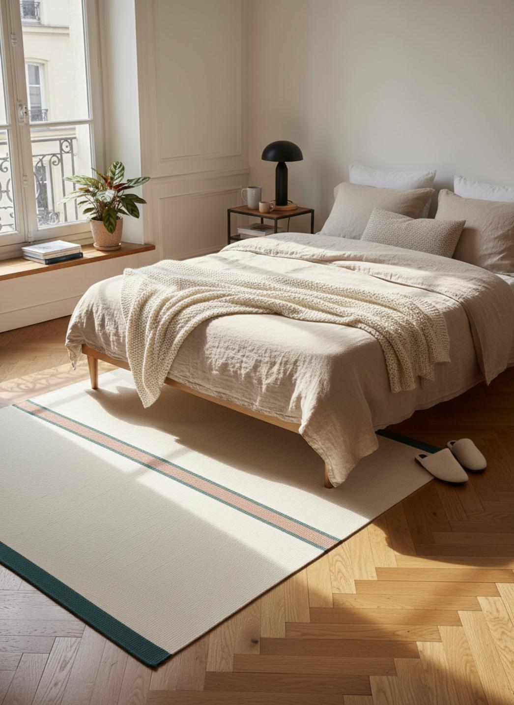Penser l’espace autour de ce tapis, c’est composer avec une forme étudiée pour équilibrer volumes et mobilier. Le format 120x170 propose une échelle idéale pour définir un coin canapé ou pour recentrer une chambre, créant un effet d’ancrage sans rigidité. Les lignes horizontales dessinent le sol et guident le regard, apportant une impression d’ordre doux et contemporain.