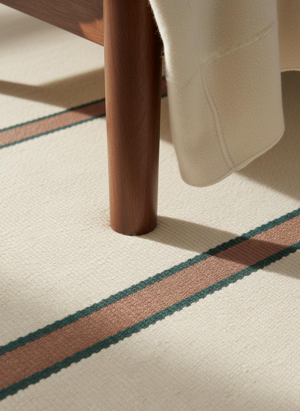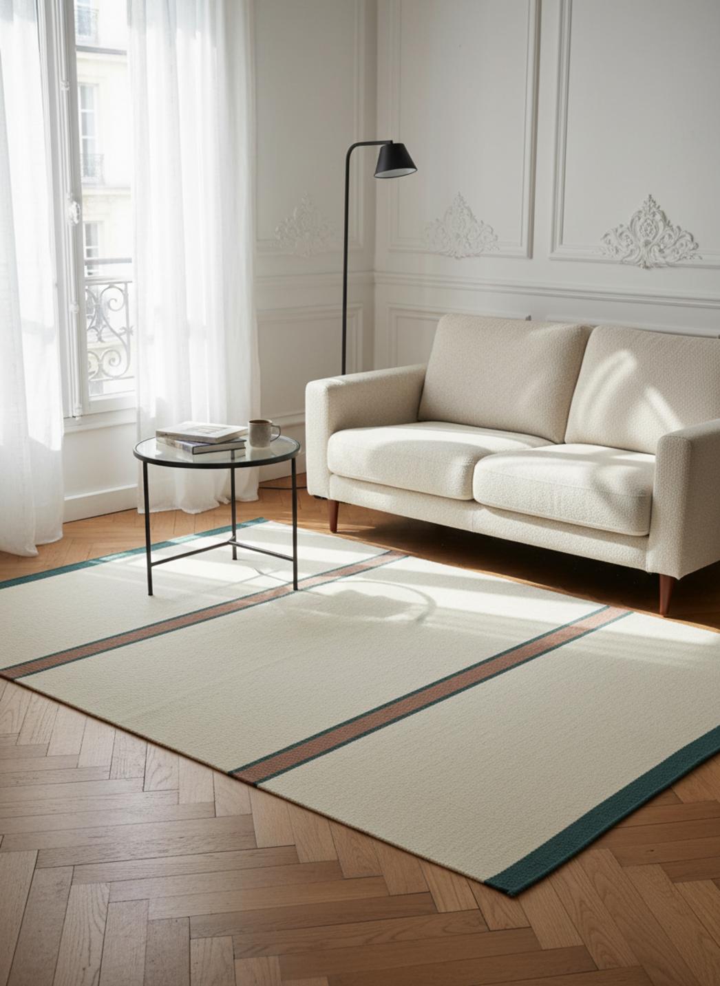 Imaginez une pièce où la lumière glisse sur une texture subtile, où une présence douce ancre l’espace sans l’alourdir. Cette création incarne une ambiance contemporaine et chaleureuse, jouant des lignes et des contrastes pour offrir immédiatement un point de repos visuel. Les alternances de bandes apportent rythme et sérénité, comme des respirations graphiques qui structurent le salon ou un coin lecture.