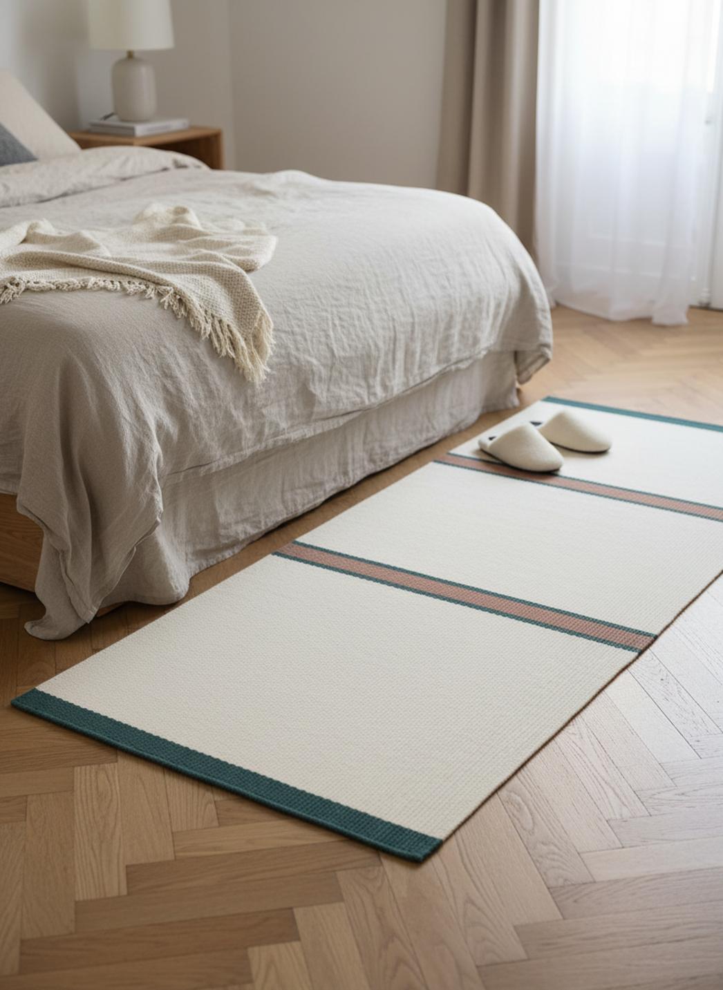 L’impact décoratif se lit dans la manière dont ce tapis redéfinit une descente de lit, un coin lecture ou un espace de vie. Ses proportions étudiées, spécialement conçues pour s’inscrire au pied du lit, structurent la pièce et recentrent le mobilier. La dimension 70x200 cm devient un repère esthétique, modulant les perspectives et apportant un point d’ancrage visuel qui harmonise volumes et circulation.