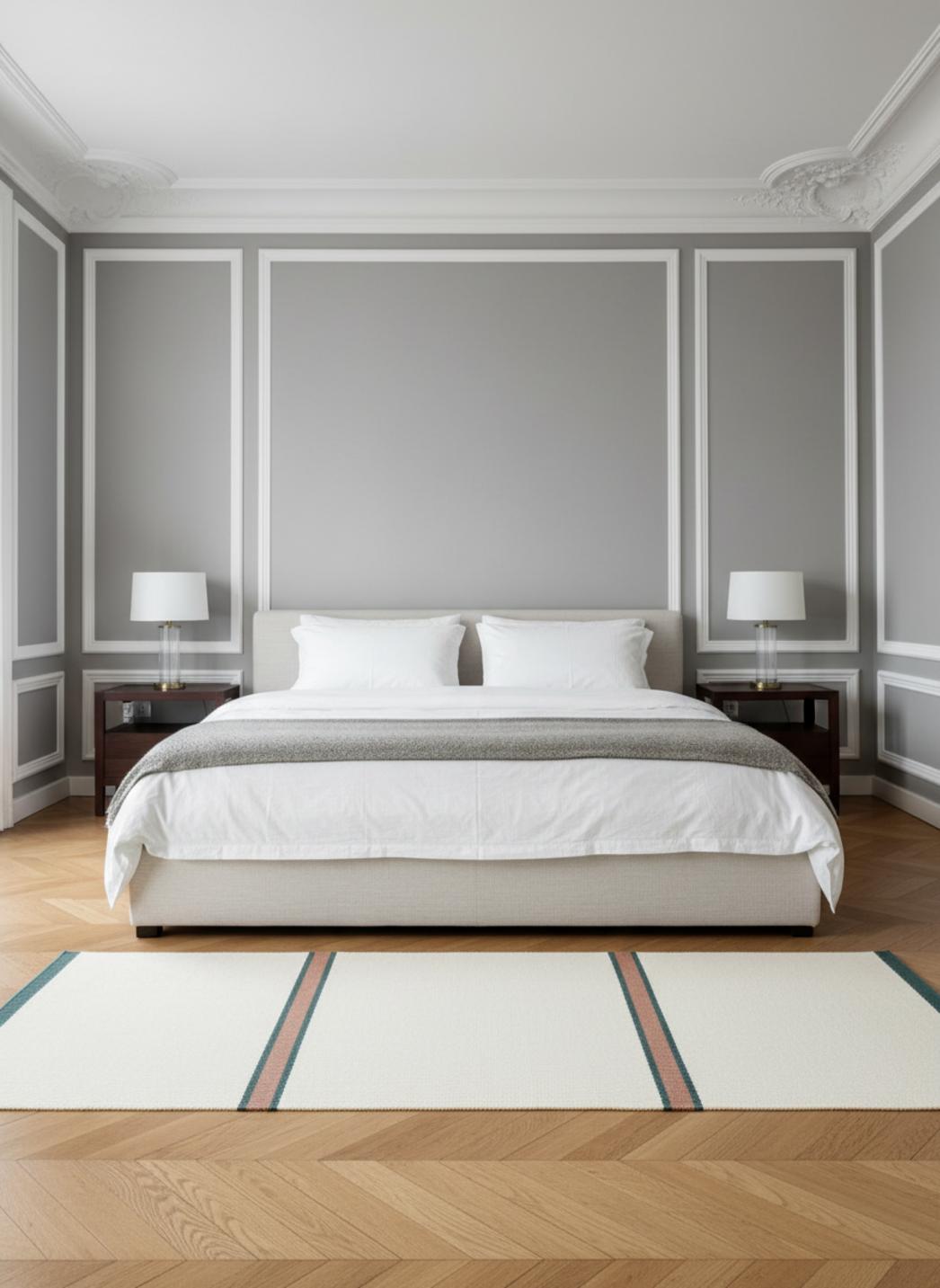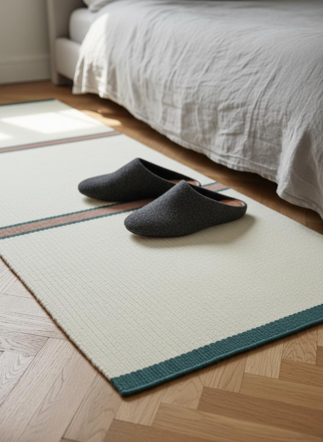Sous un éclairage doux, la pièce se transforme autour d’un tapis qui réinterprète la simplicité en une note contemporaine. Les lignes s’étirent sans heurt, dessinant un chemin visuel qui accueille le regard et fait écho aux volumes du mobilier. Le motif à bandes organise l’espace avec élégance, alternant champs de calme et traits plus affirmés pour un équilibre subtil entre mouvement et repos.