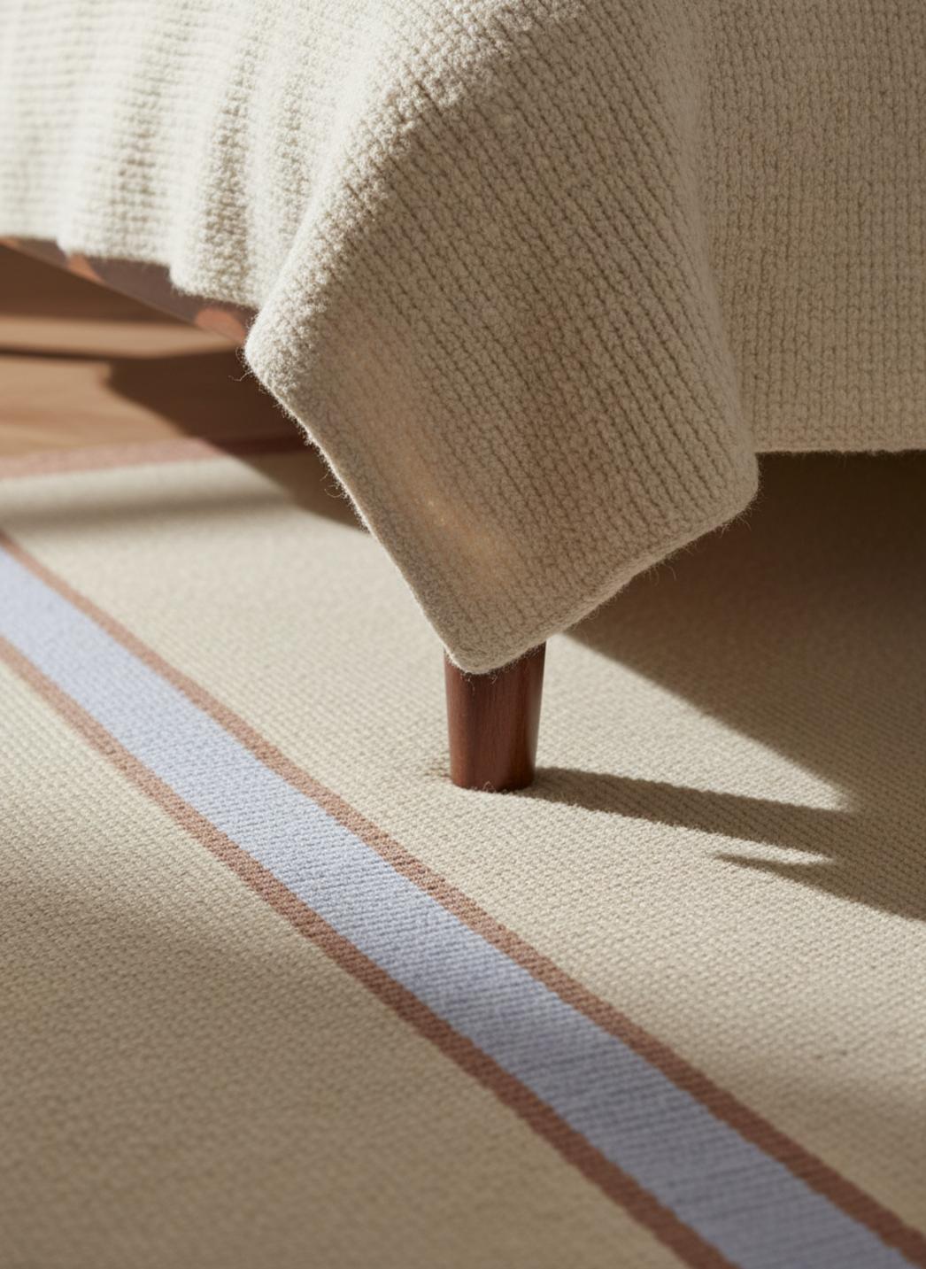 La signature graphique repose sur des bandes soigneusement dosées, une alternance qui joue de contrastes subtils. Les nuances marron répondent aux notes profondes du mobilier, tandis que les éclats de bleu apportent une énergie lumineuse réinterprétée de façon moderne, comme un dégradé maîtrisé plutôt qu’un simple motif.