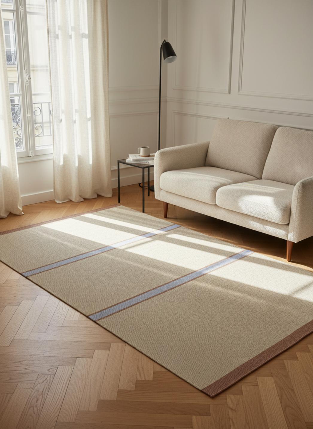 La proportion pensée pour un format 120x170 propose un ancrage idéal pour un coin salon ou une chambre. La forme rectangulaire crée une ligne d’horizon discrète qui organise les volumes, invite à la circulation et définit un tapis comme pièce pivot plutôt que simple accessoire.
