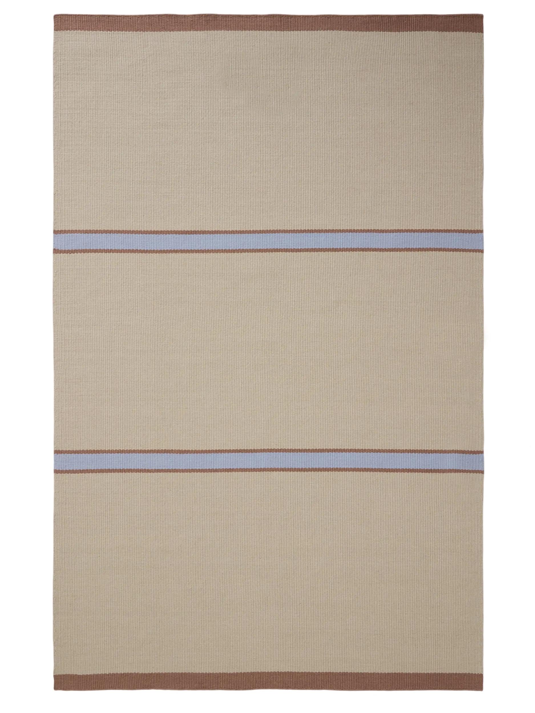 La signature graphique repose sur des bandes savamment espacées, une écriture rythmée qui ménage des respirations entre les nuances. Le jeu chromatique mêle un marron profond, terreux et apaisant, à un bleu mat, lumineux mais retenu, pour une palette qui traduit une modernité élégante plutôt qu’une ostentation. Ces teintes, traitées en tonalités sourdes et harmonisées, redessinent l’espace sans le dominer.