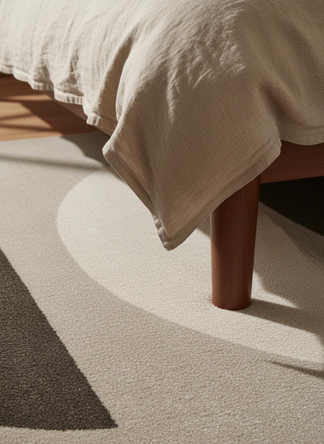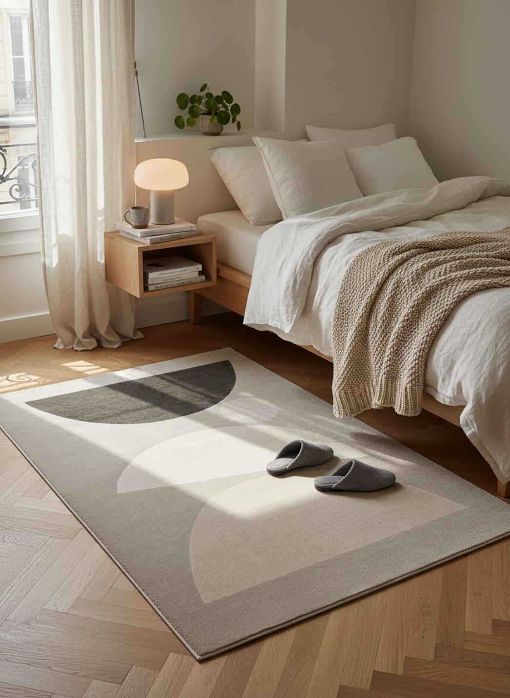 Lumière et lignes s’accordent avec une simplicité maîtrisée pour créer une atmosphère apaisée, où chaque rayon met en valeur la présence discrète du tapis. Le dessin prend place sans alourdir, et la pièce gagne en profondeur grâce à une géométrie douce qui respecte l’espace. L’élégance se lit dans le contraste des plans, révélant une signature contemporaine qui reste chaleureuse et accessible.