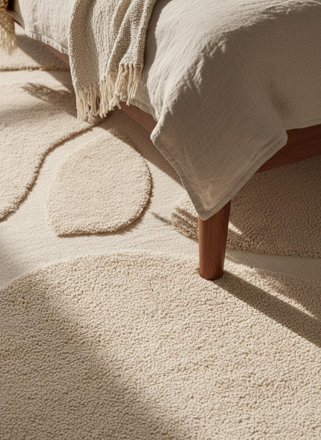 Sous les pas, la densité du tissage révèle une sensation à la fois moelleuse et structurée. Le relief texturé amplifie la sensation tactile : une douceur rassurante, une prise enveloppante qui invite à s'attarder pieds nus. Les lignes sinueuses et les zones plates se répondent pour créer un toucher pluriel, à la fois accueillant et précis dans son dessin.