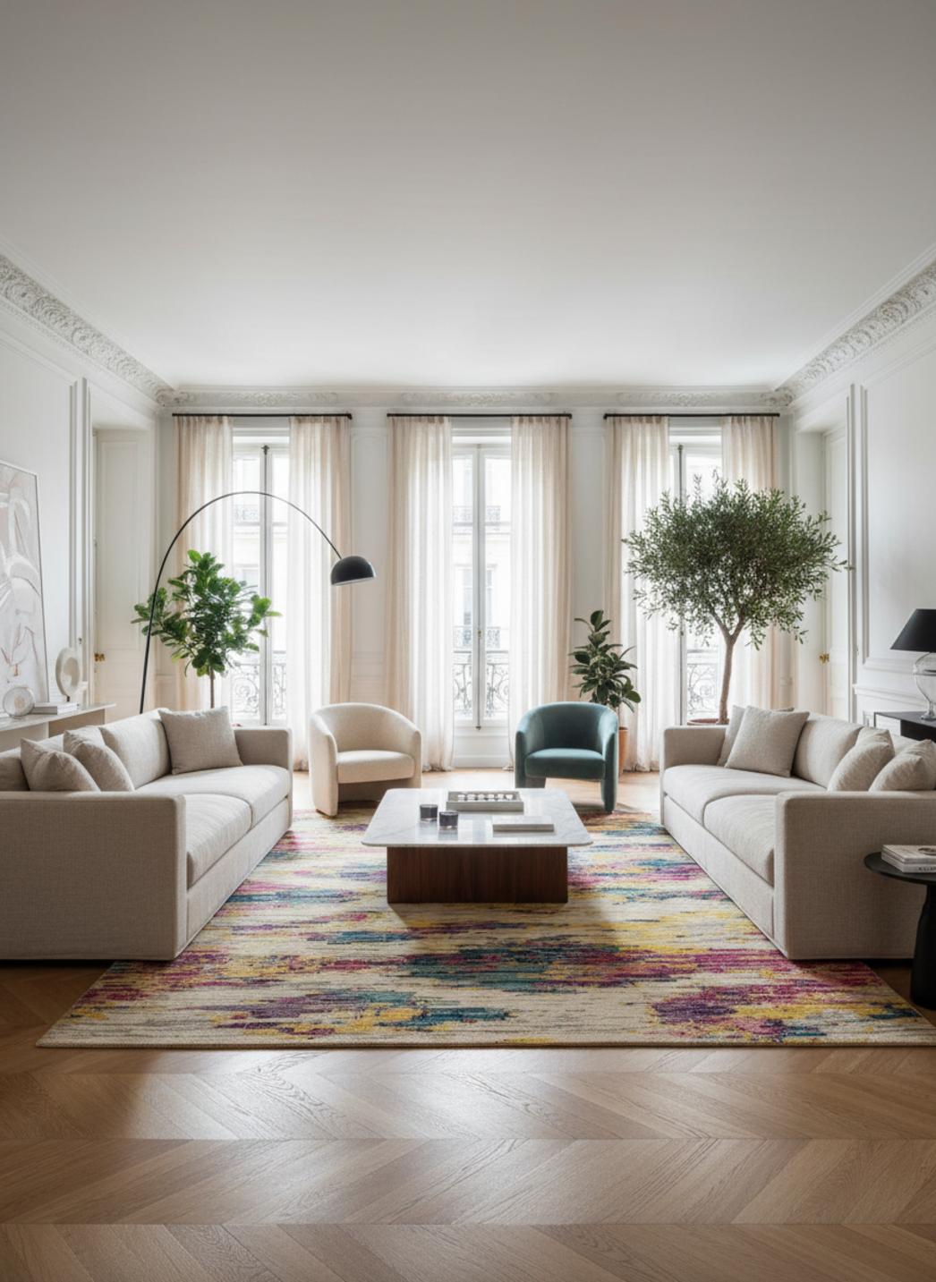 La matière offre un toucher enveloppant, à la fois moelleux et tactile, qui appelle à poser ses pieds et à s’attarder. La densité de la surface procure une sensation de cocon, tandis que la palette multicolore se mêle à la lumière naturelle pour donner de la profondeur sans surcharger l’espace.