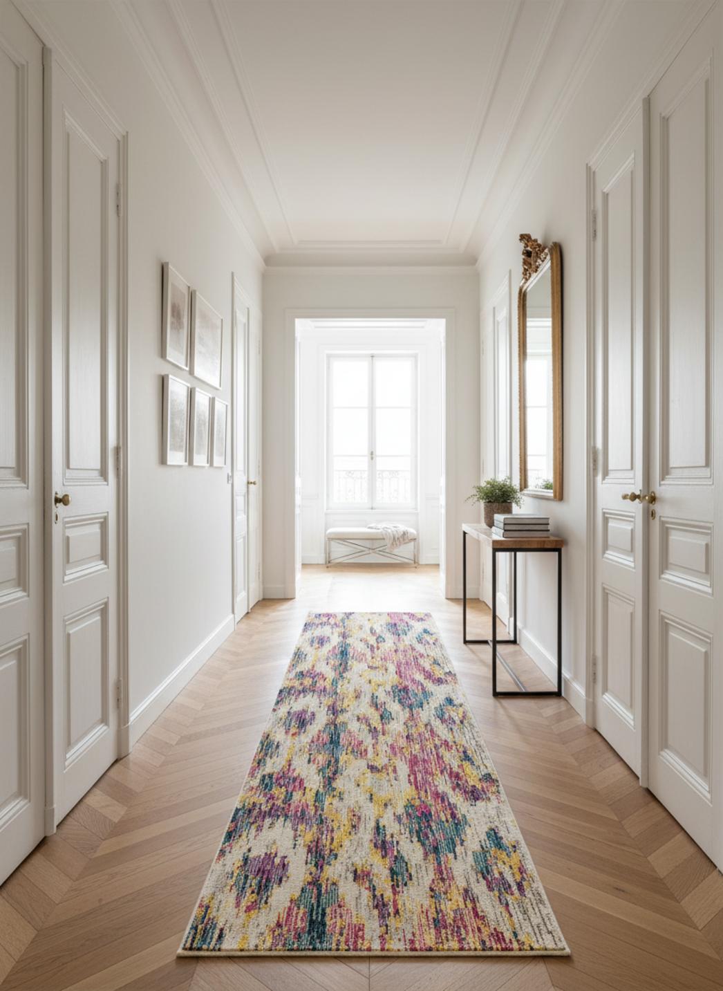 Sous la lueur naturelle d’une fenêtre, il s’étire et dessine une promenade visuelle, parfaitement pensé pour un couloir qui devient alors un fil conducteur décoratif. L’allonge du tapis crée une perspective invitante, soulignant le bois des plinthes, les paniers en rotin et un guéridon planté de verdure. Le sens du détail artisanal apparaît dans les irrégularités assumées, petites imperfections qui racontent un geste humain et offrent au regard une chaleur rythmée et sincère.