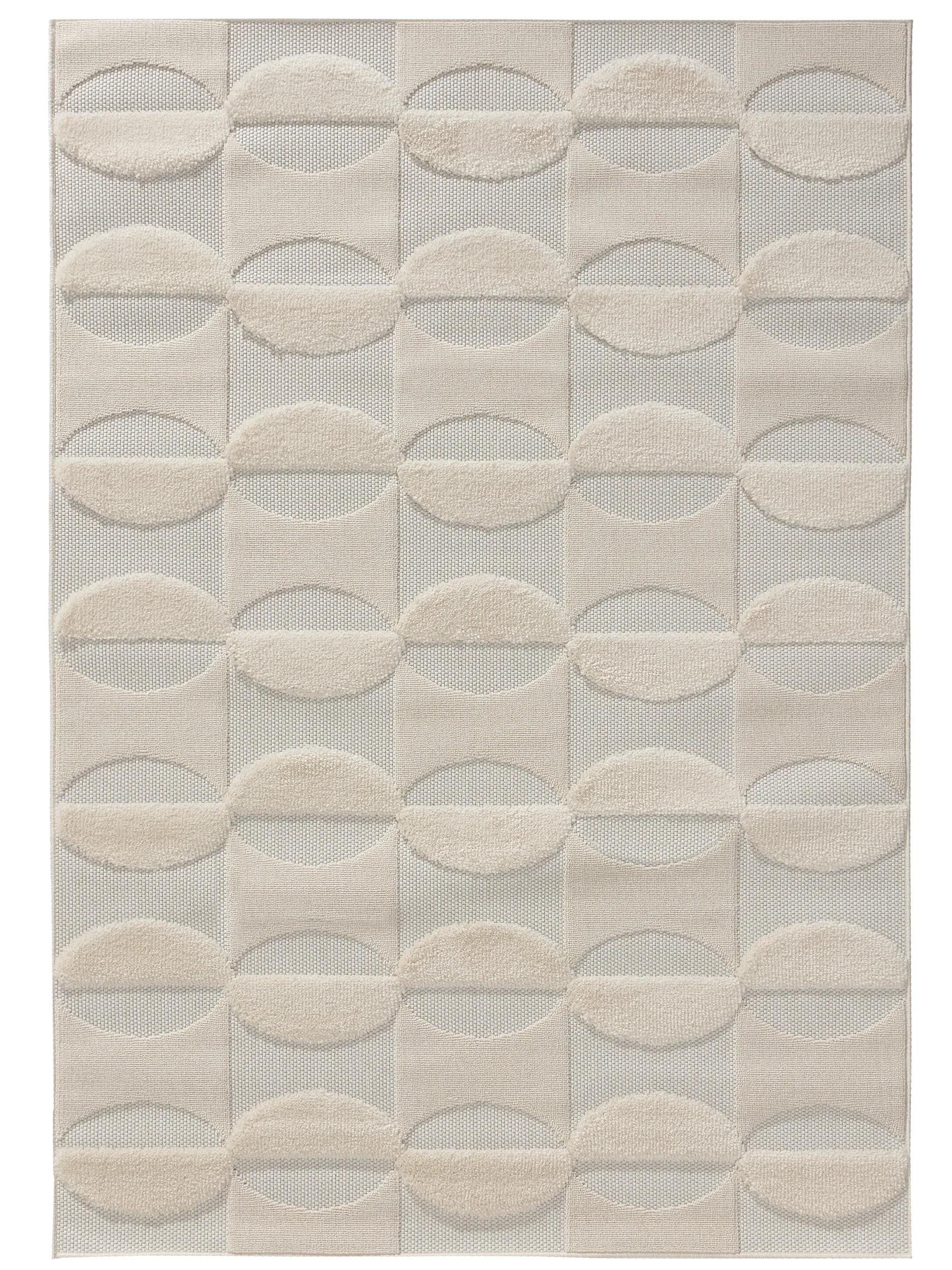 Dans un intérieur baigné de lumière, ce tapis s'impose comme une signature douce et structurée, un objet à la fois rassurant et aérien. Le parti pris contemporain se lit dans la simplicité des volumes et dans la manière dont le sol devient un espace de calme, où la teinte crème invite à la chaleur subtile sans jamais alourdir la pièce. Le motif géométrique joue le rôle d'un langage visuel clair, posé et élégant.