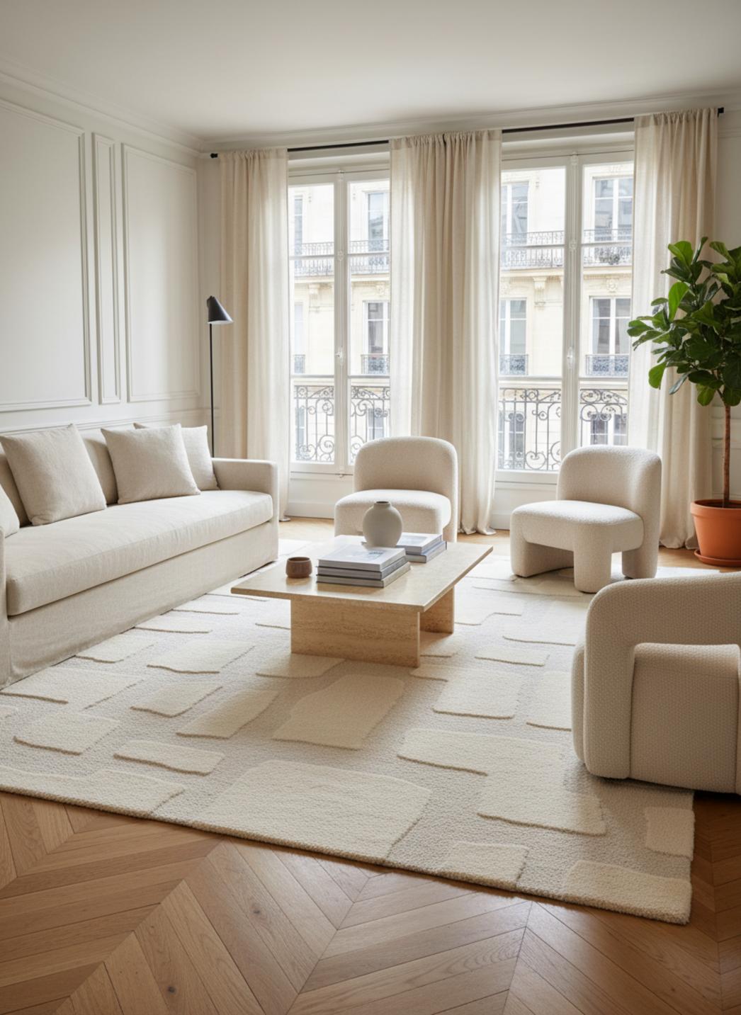 Dans un séjour baigné de lumière, l'ambiance contemporaine se précise autour d'une silhouette discrète et sophistiquée, capable d'unir volumes et douceur. Le tapis installe un point d'équilibre visuel sans imposer, guidant le regard vers le canapé ou le coin lecture tout en laissant respirer l'espace. Les lignes du design invitent à la sérénité et suggèrent un cadre apaisant, prêt à accueillir des instants de calme ou des moments partagés.