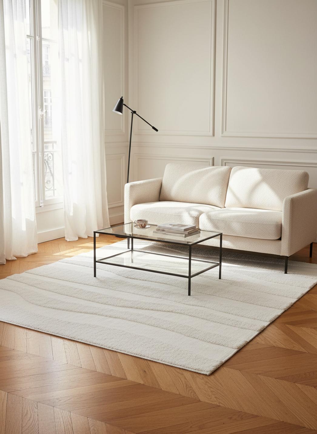 La pièce se transforme sous une lumière douce, où chaque rayon souligne les ondulations d’un motif vague qui semble respirer au rythme de la pièce. L'esthétique contemporaine s'exprime par des lignes apaisées et une palette épurée, offrant un point focal discret qui structure le salon sans le dominer.