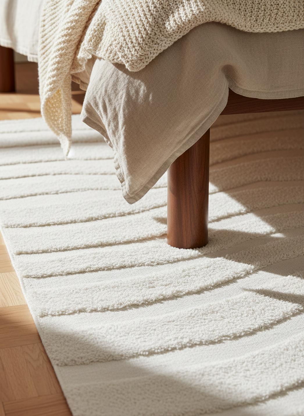 L’ensemble du tapis reste discret et affirmé, jouant la carte d’une modernité douce : les vagues texturées rythment la pièce sans charger la composition, tandis que le coton préserve une sensation organique et facile à vivre. L’impact visuel se fait par contraste et par simplicité, renforçant l’harmonie des volumes.