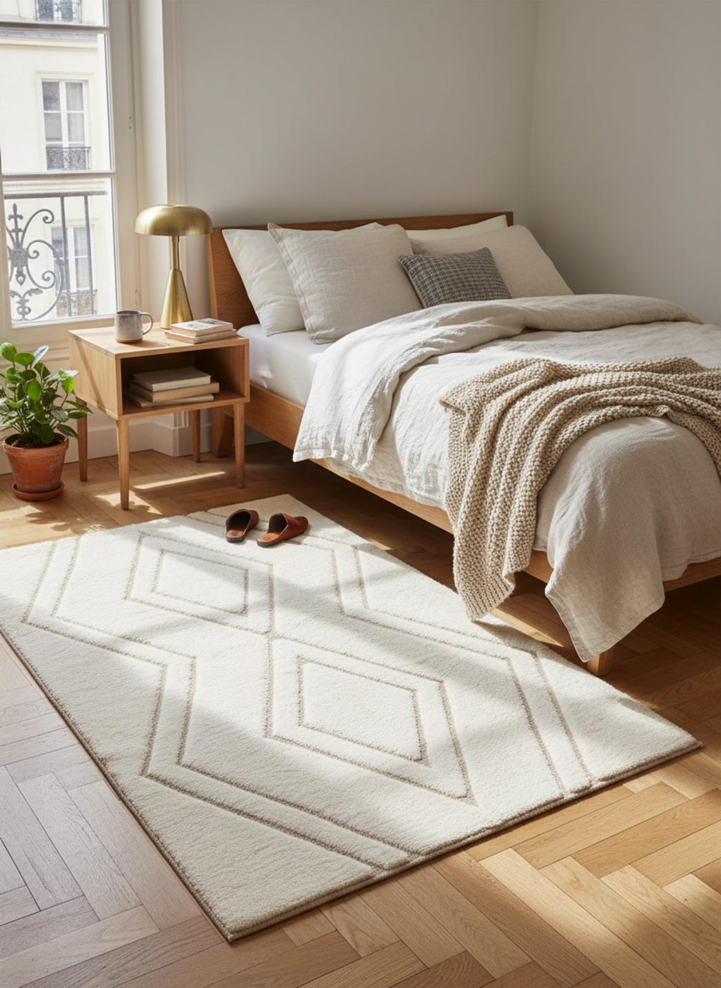 Dans une atmosphère qui évoque les maisons du Haut-Atlas revisitées pour un intérieur actuel, ce tapis joue la partition douce du style berbère, où la simplicité des lignes devient motif et invitation. Le toucher texturé se fait promesse de confort, comme un voile chaud qui s’installe au sol et transforme l’espace en un cocon lumineux et accueillant.