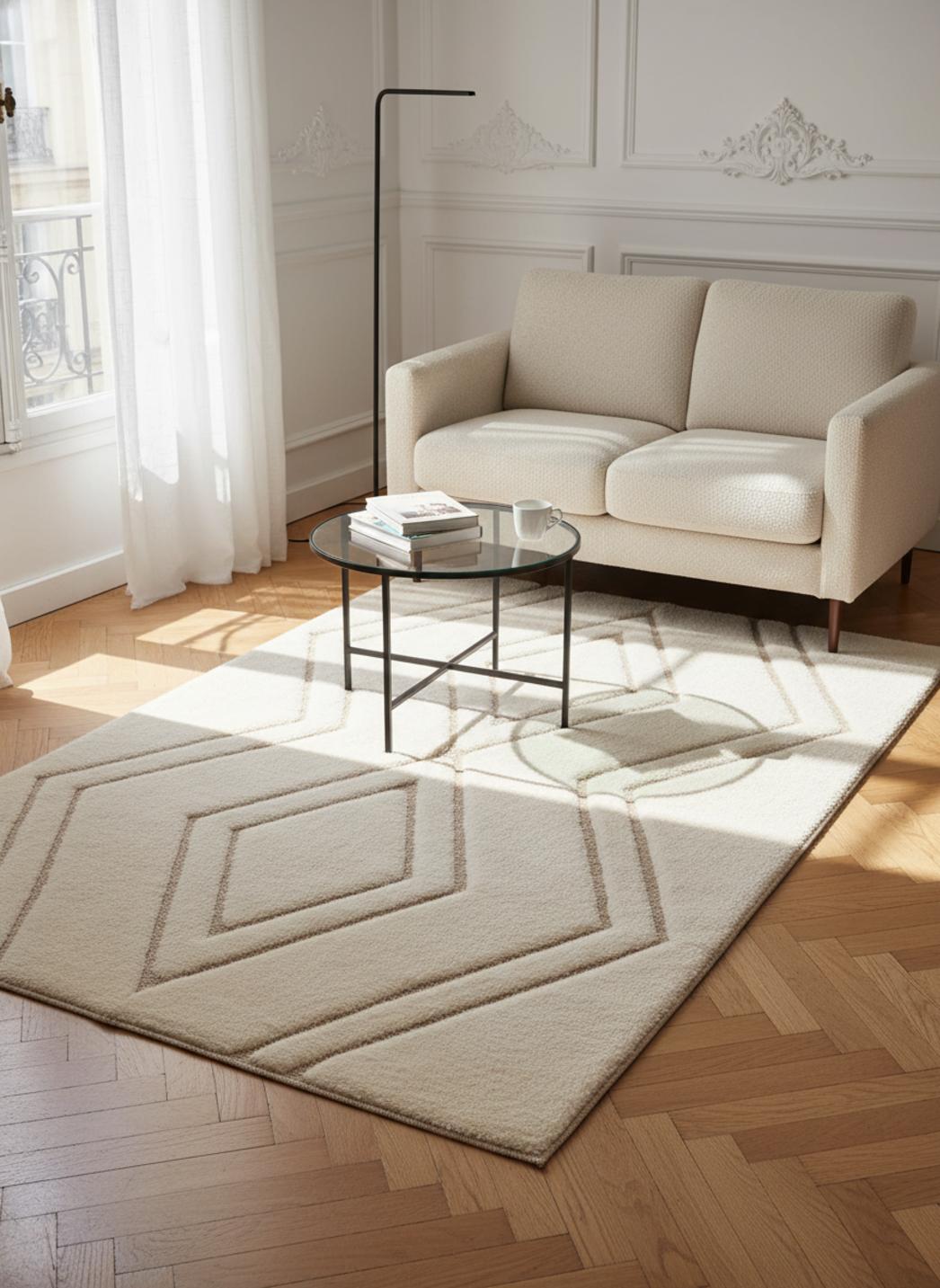 Son palette joue avec la lumière : des nuances de crème et de beige se répondent et amplifient la clarté naturelle, rendant l’ensemble facile à assortir avec le bois blond, le rotin et le lin. Le résultat est une ambiance douce et aérienne, où chaque fibre paraît éclairer la pièce et souligner une décoration bohème chic et raffinée.