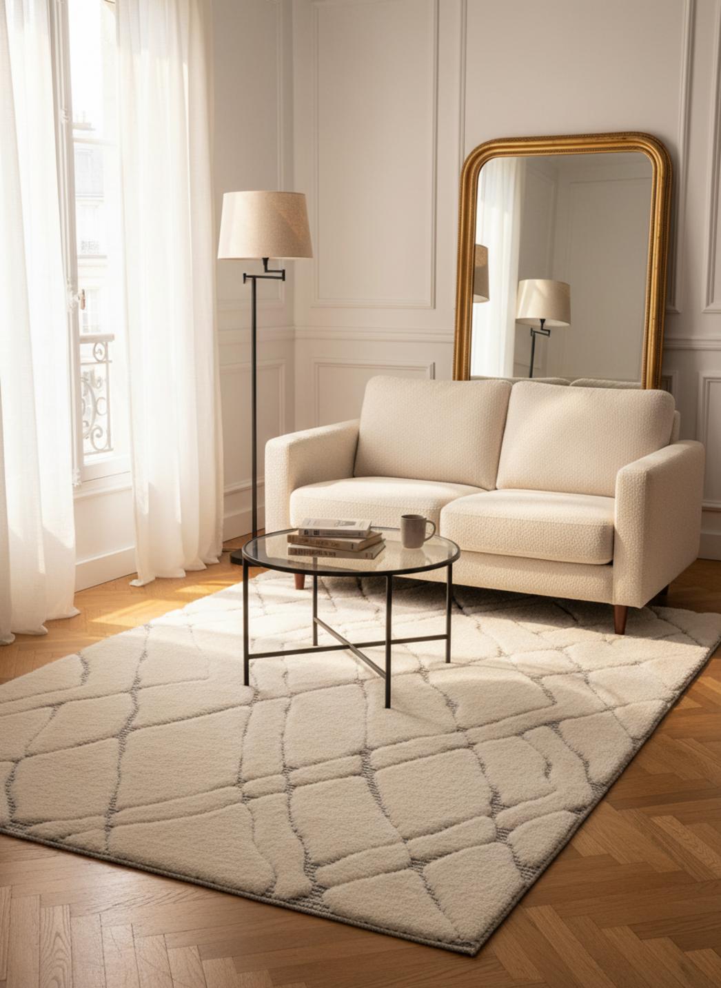 Dans un salon baigné de lumière, le dessin s'ouvre comme une histoire tissée à la main, réinterprétant la tradition berbère avec une élégance discrète. La palette douce, jouant entre crème et gris, crée une toile apaisante qui invite au repos. Le motif, sobre et géométrique, rappelle les losanges et les lignes irrégulières propres aux pièces ancestrales, ici traduits dans une signature moderne et chaleureuse.