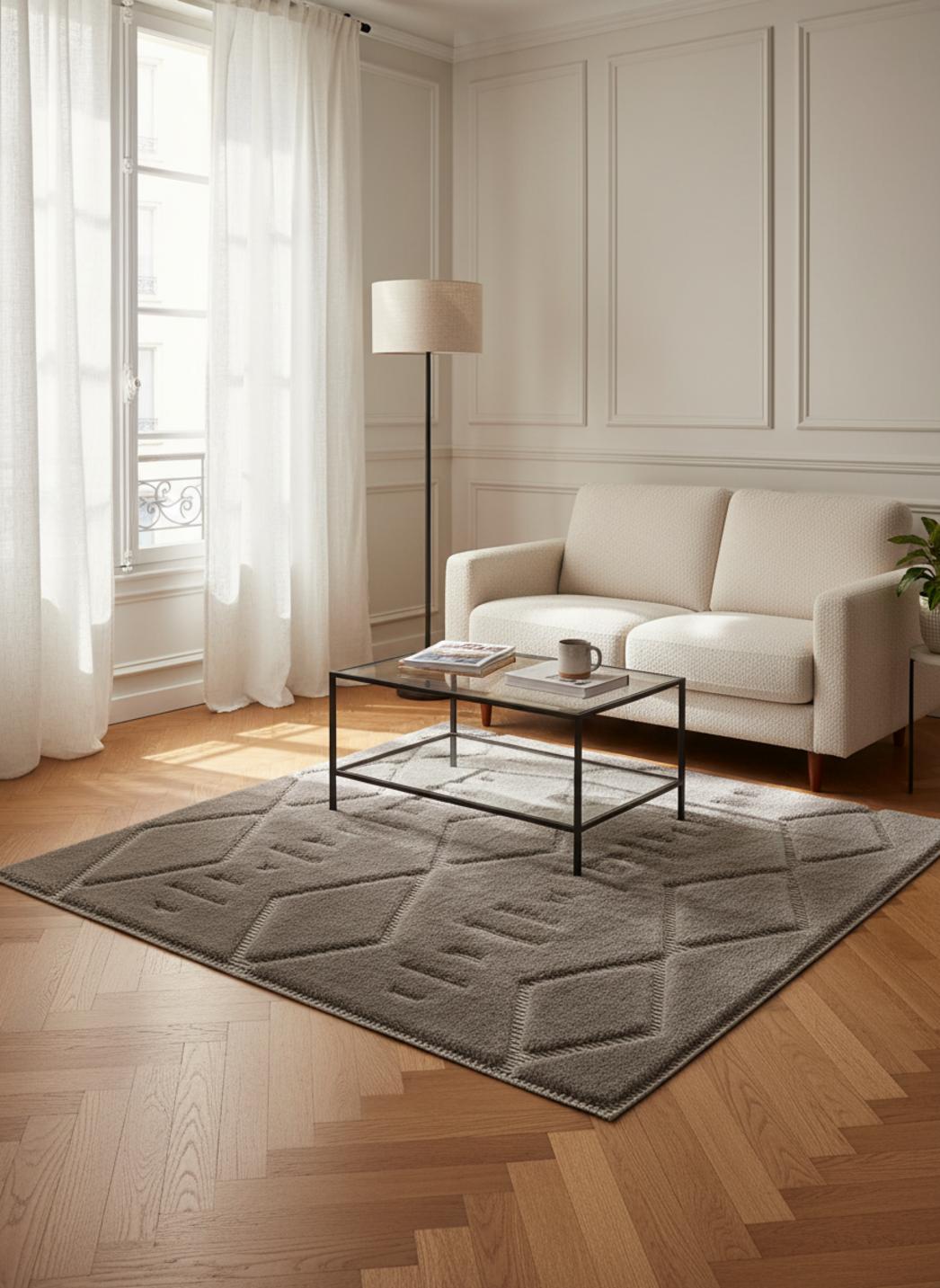 Loin d'être froid, le jeu des motifs et des contrastes apporte chaleur et personnalité ; la pièce devient instantanément plus intime, propice aux après-midi calmes et aux soirées cocooning. La lumière naturelle caresse les reliefs et offre des variations subtiles, rendant chaque angle unique et vivant.