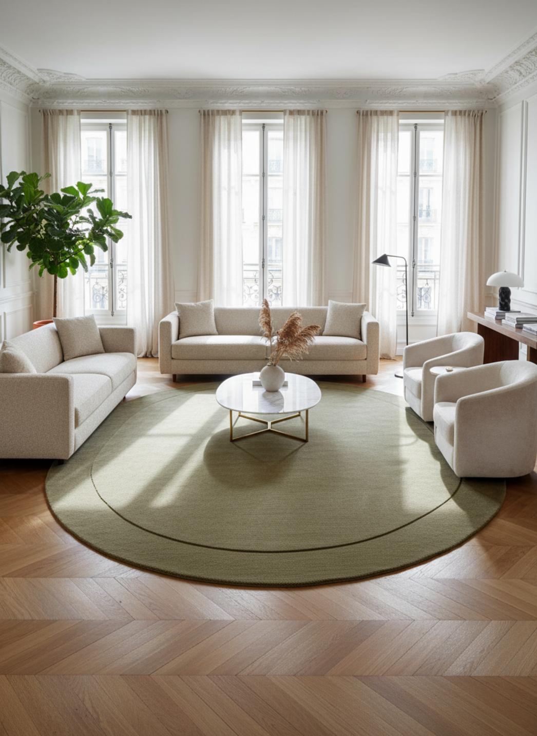 Autour du tapis, l’aménagement gagne en cohérence : il structure un salon, définit un coin lecture, embrasse un lit et crée un cocon propice au repos. Le design circulaire apparaît comme un élément fédérateur, capable de recentrer visuellement une grande pièce ou de composer un îlot cosy dans un espace ouvert. Les motifs subtils, s’il y en a, restent discrets pour privilégier l’harmonie et la fluidité.