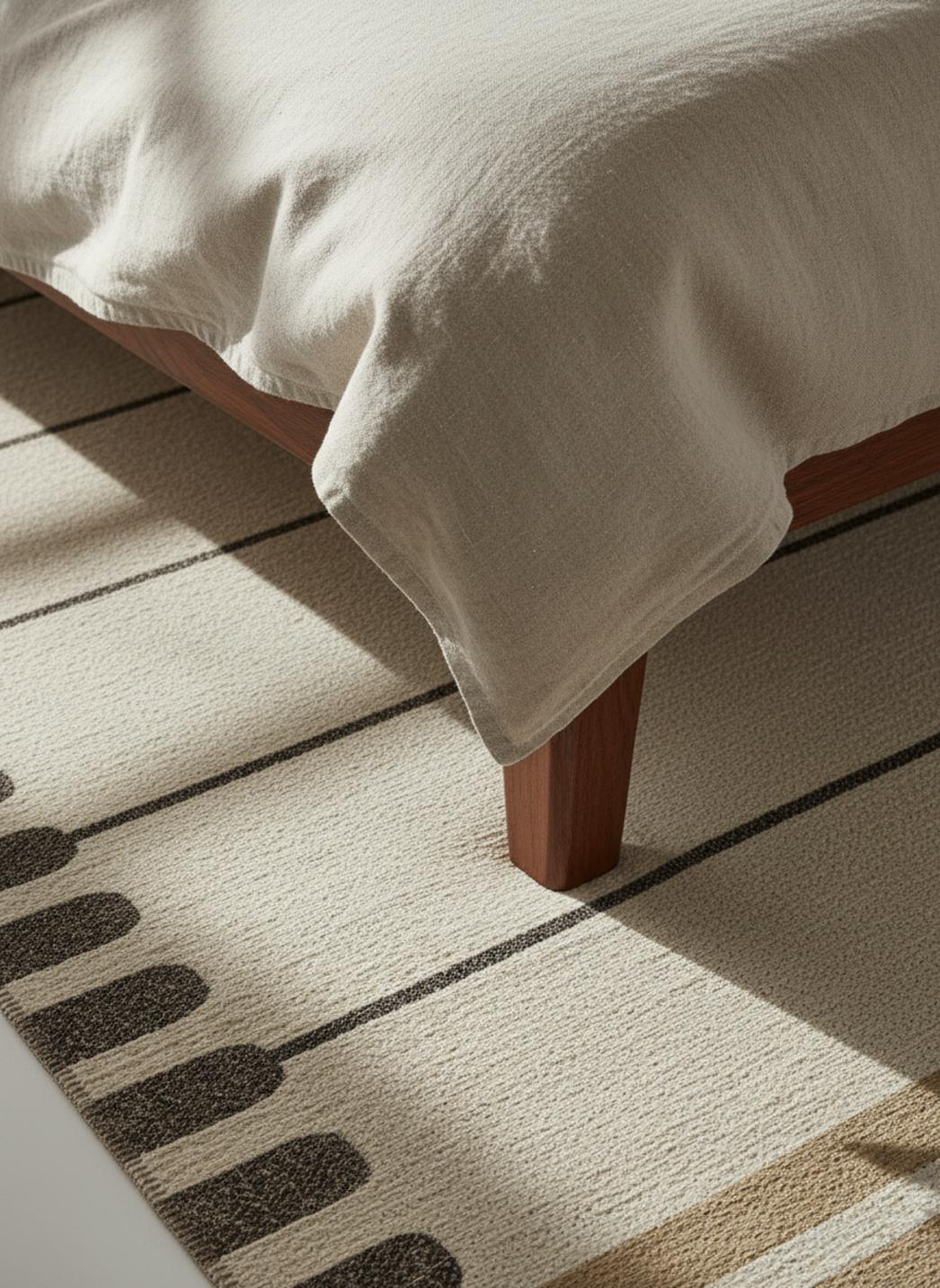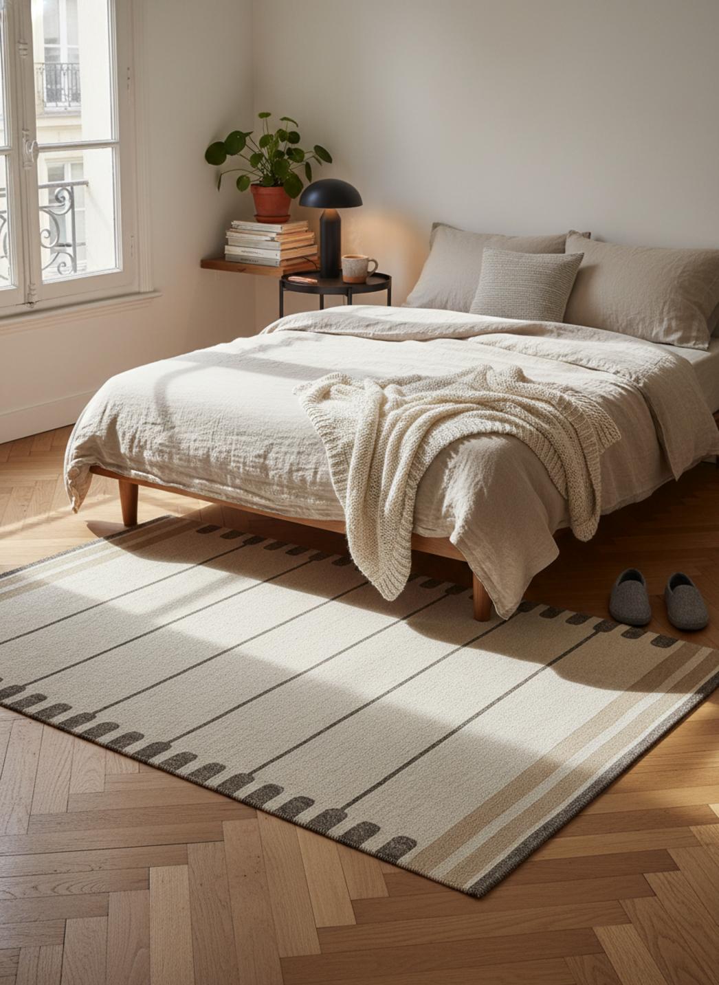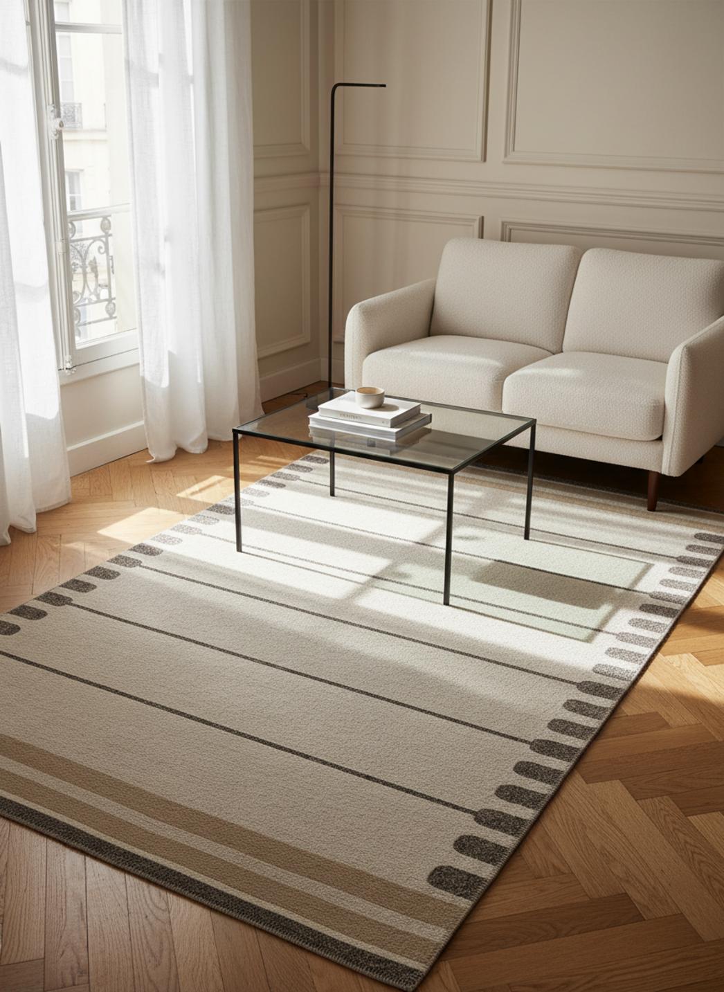On ressent la qualité d'une confection pensée pour durer : la tenue dans le temps se lit dans la densité du tissage et dans le choix des teintes qui vieillissent avec élégance. L'entretien reste simple et respectueux de la texture : une aspiration douce suffit à préserver les nuances et le relief, assurant que la personnalité du tapis se bonifie au fil des années.
